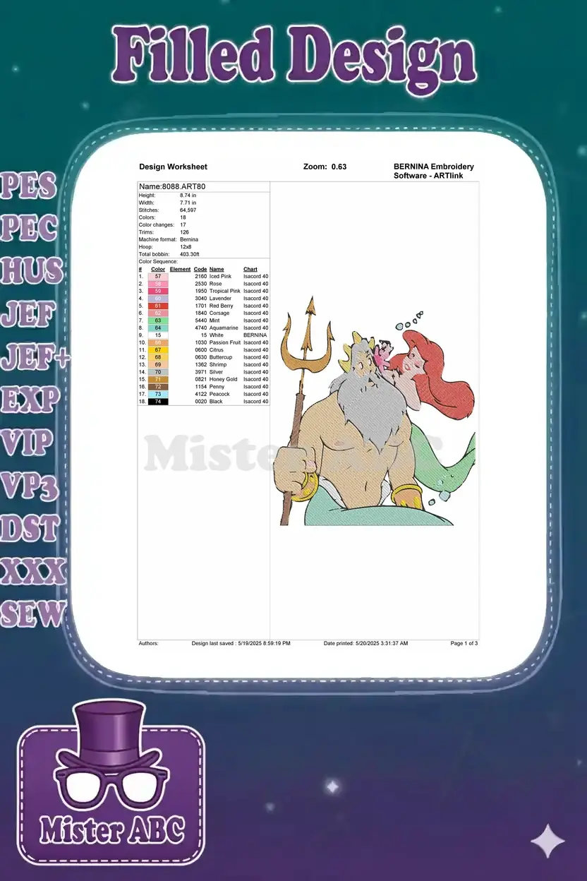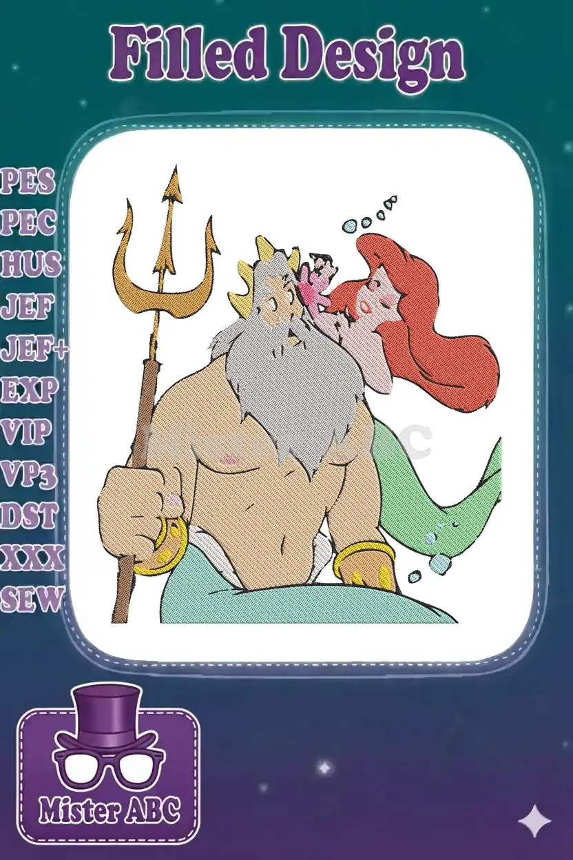Capture the magic of fatherly love with this exquisite embroidery design featuring King Triton and Ariel. Perfect for fans of the beloved underwater tale.