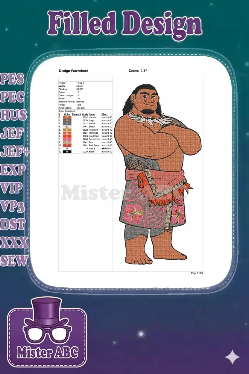 Maui demigod character embroidery designs inspired by Disney Moana