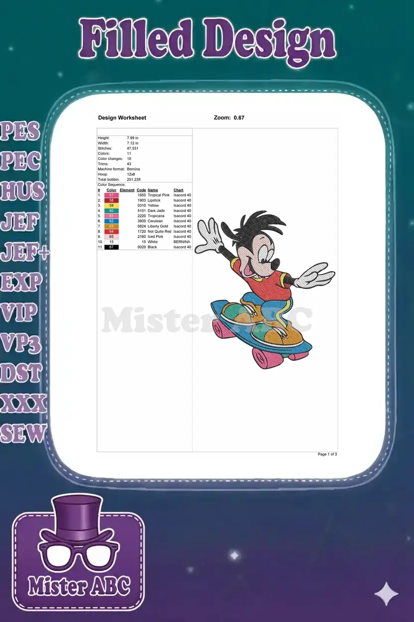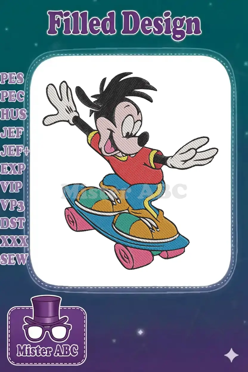 Max Goof skateboarding fun vibrant Disney character embroidery designs