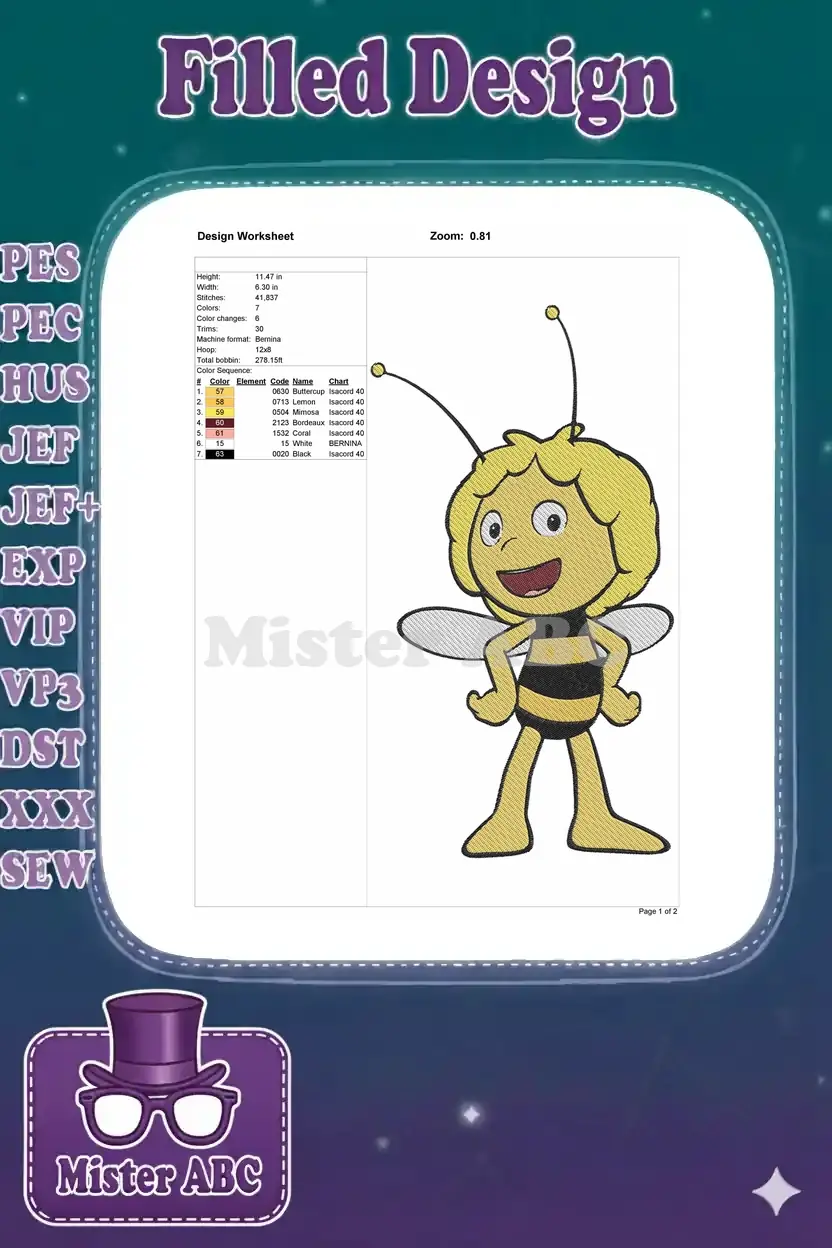 Bring the sunshine to your fabrics with this delightful Maya the Bee embroidery design. A charming, vibrant character.