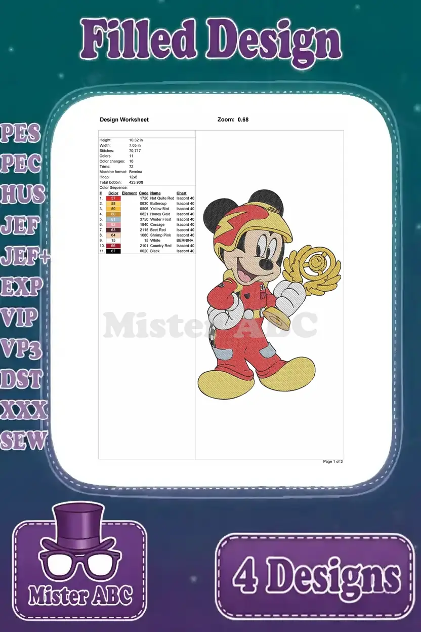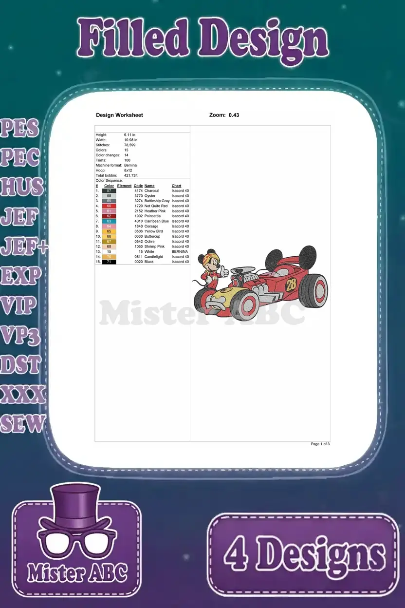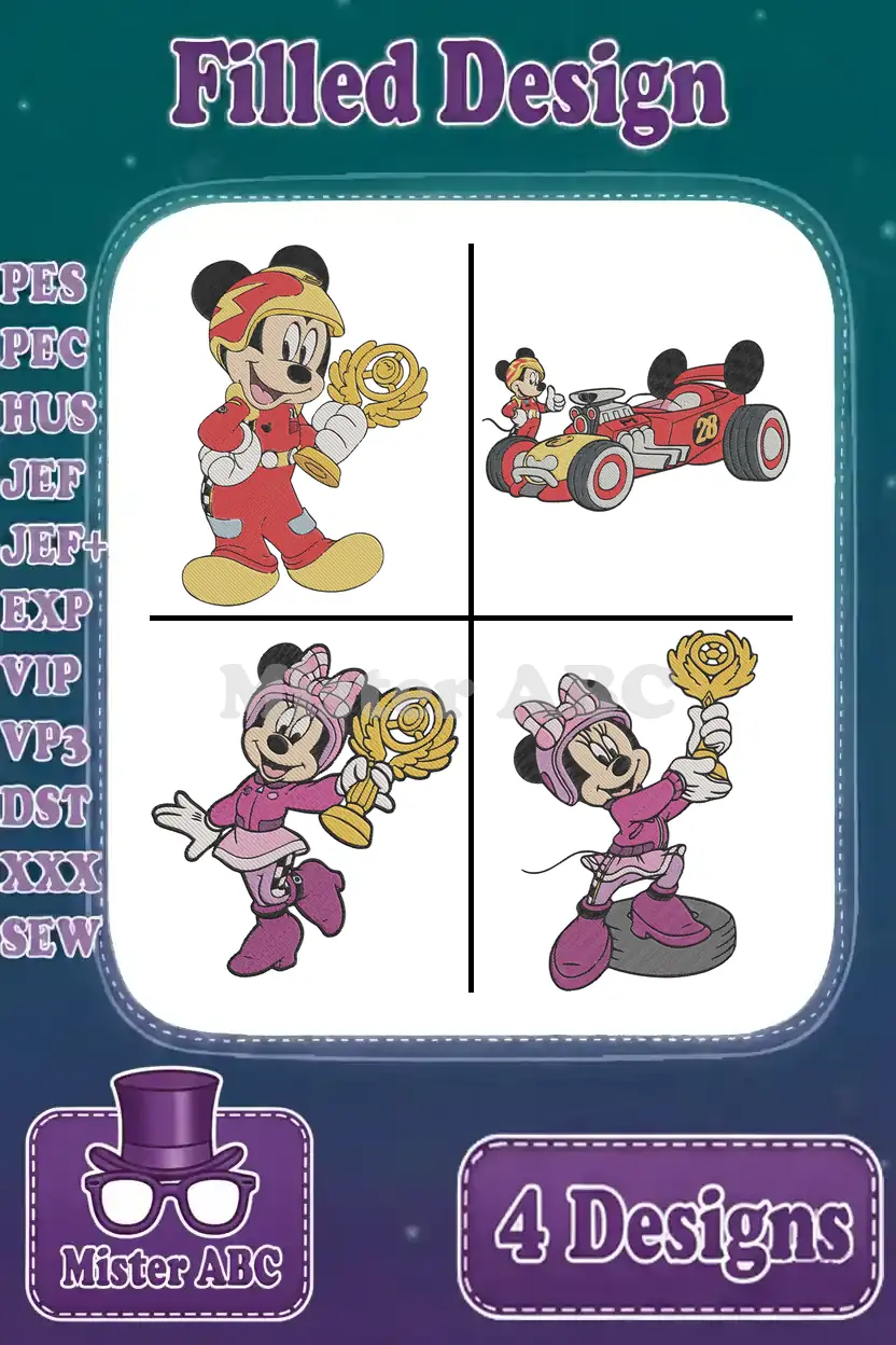 Mickey And The Roadster Racers – Mickey And Minnie Mouse With Race Cars And Trophies – Victory – Filled Embroidery Design