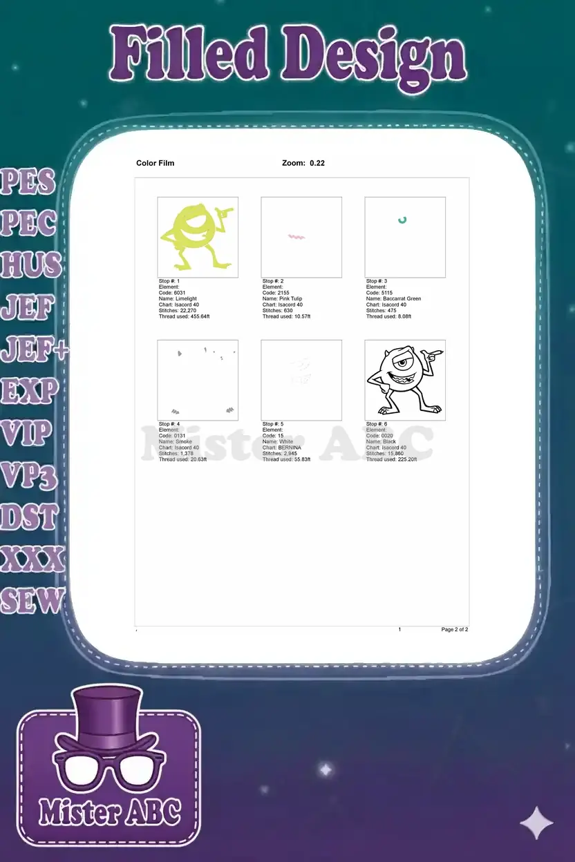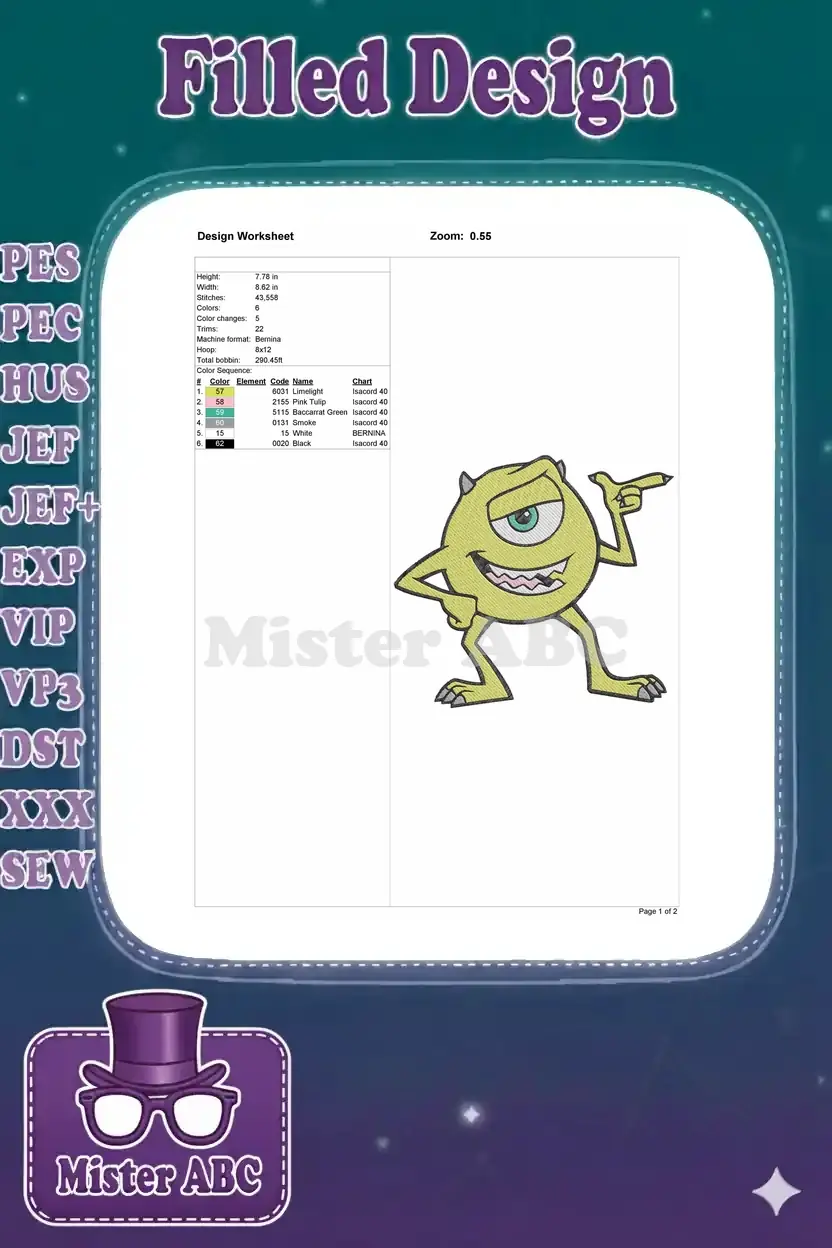 Mike Wazowski Pointing One-Eyed Green Monster Embroidery Designs