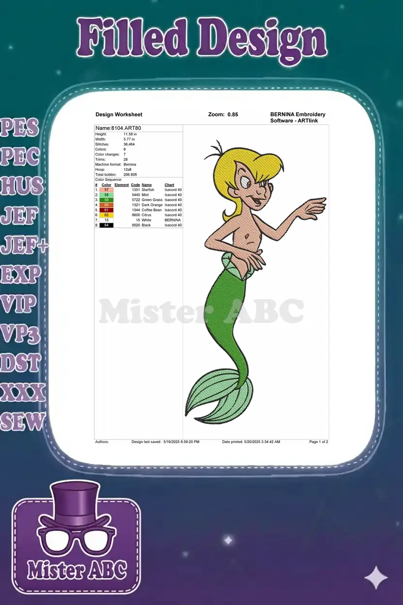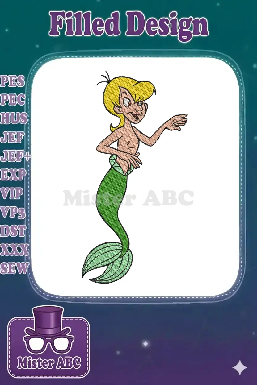 Mischievous blonde cartoon merman with green tail embroidery designs