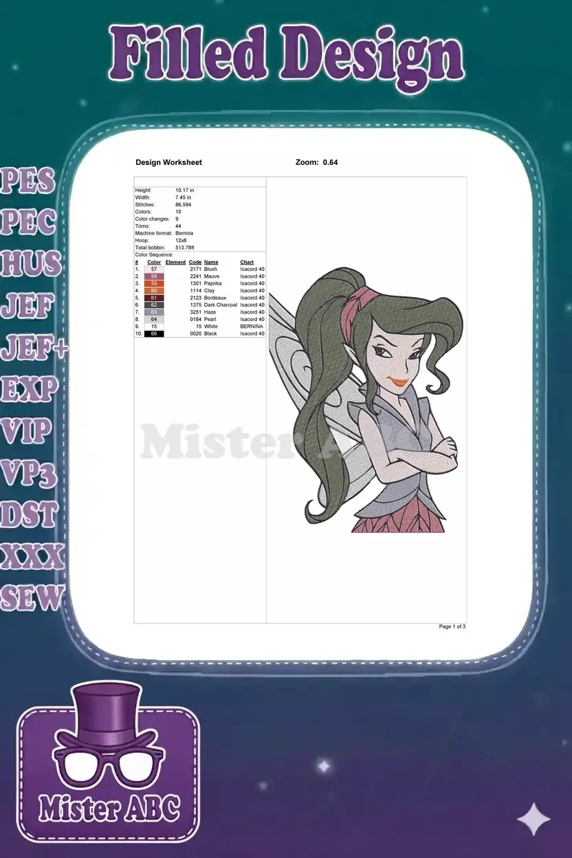 Mischievous dark fairy with pointy ears and wings embroidery designs