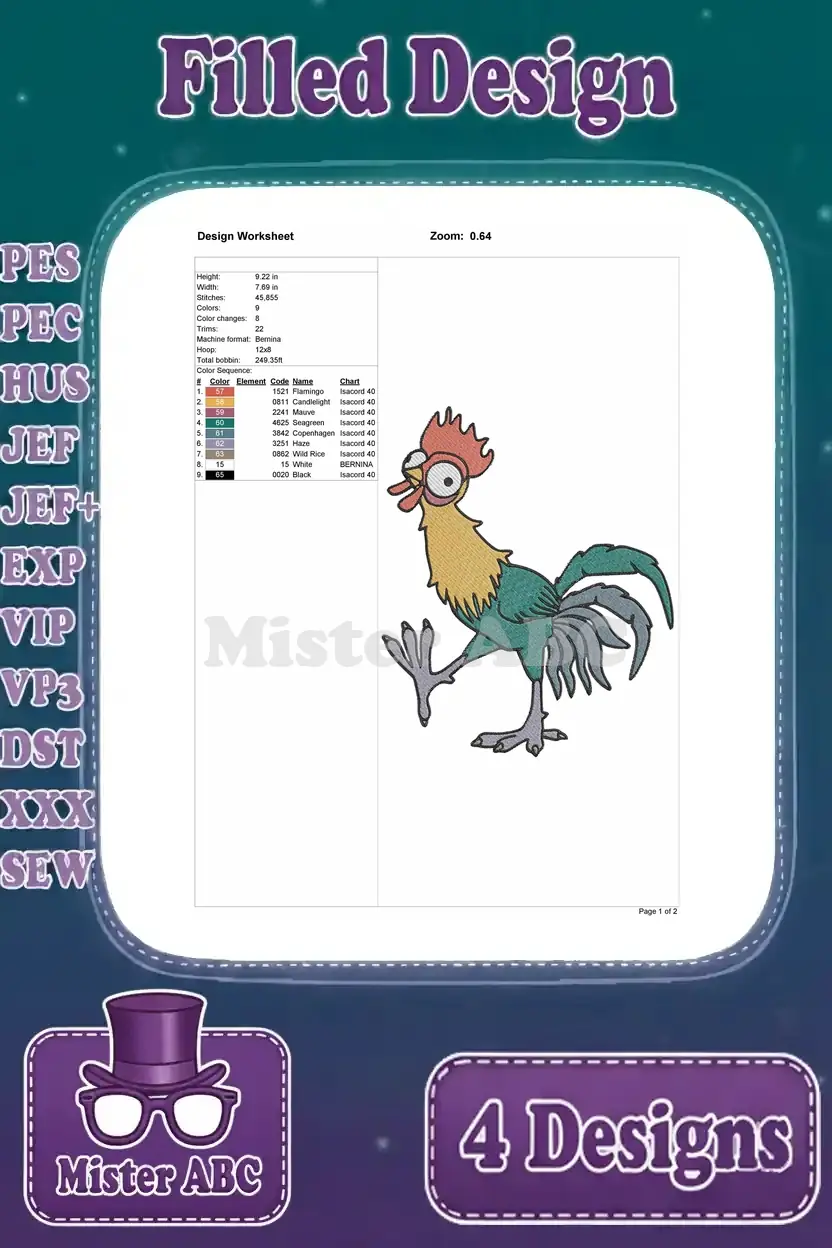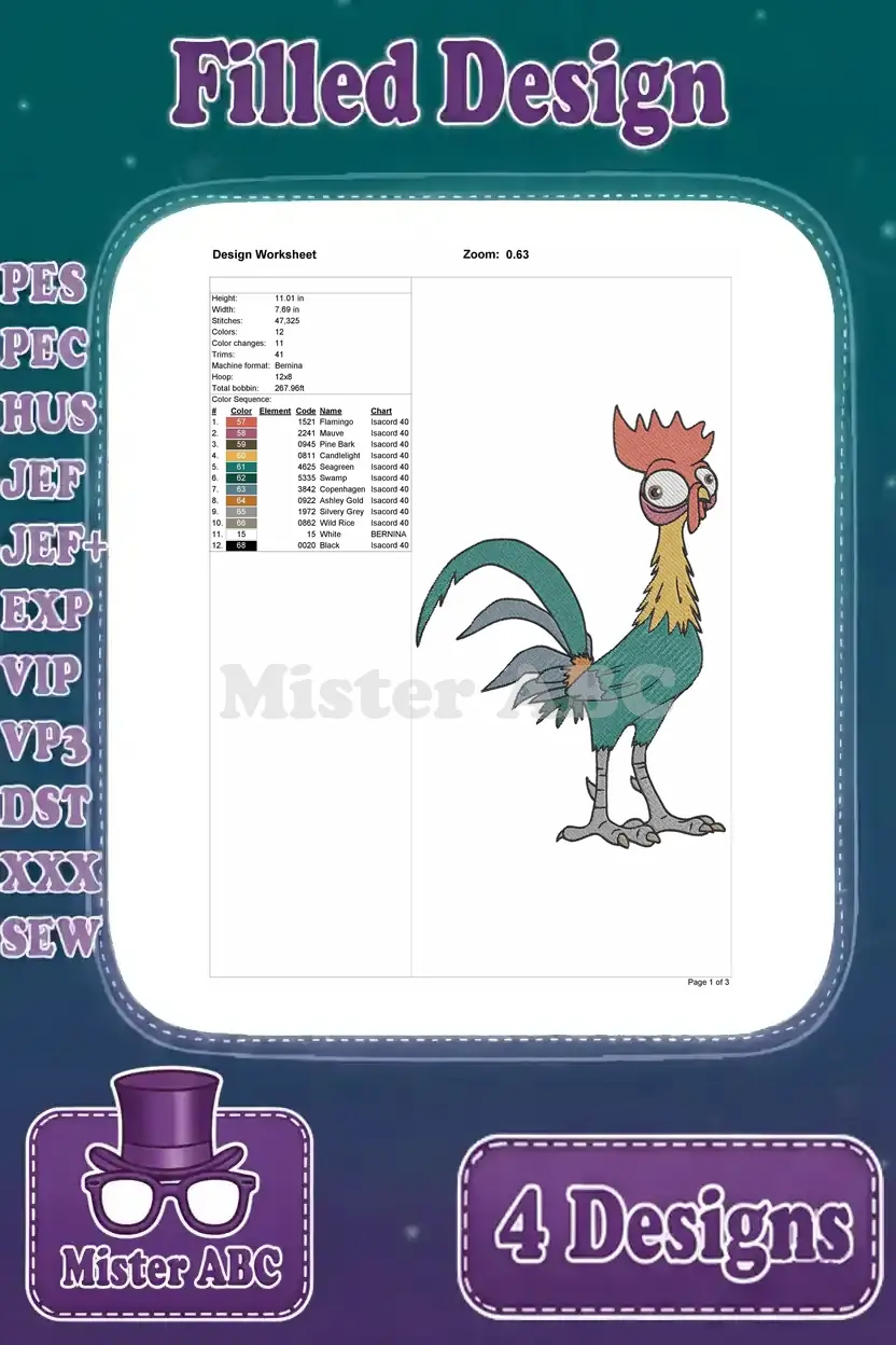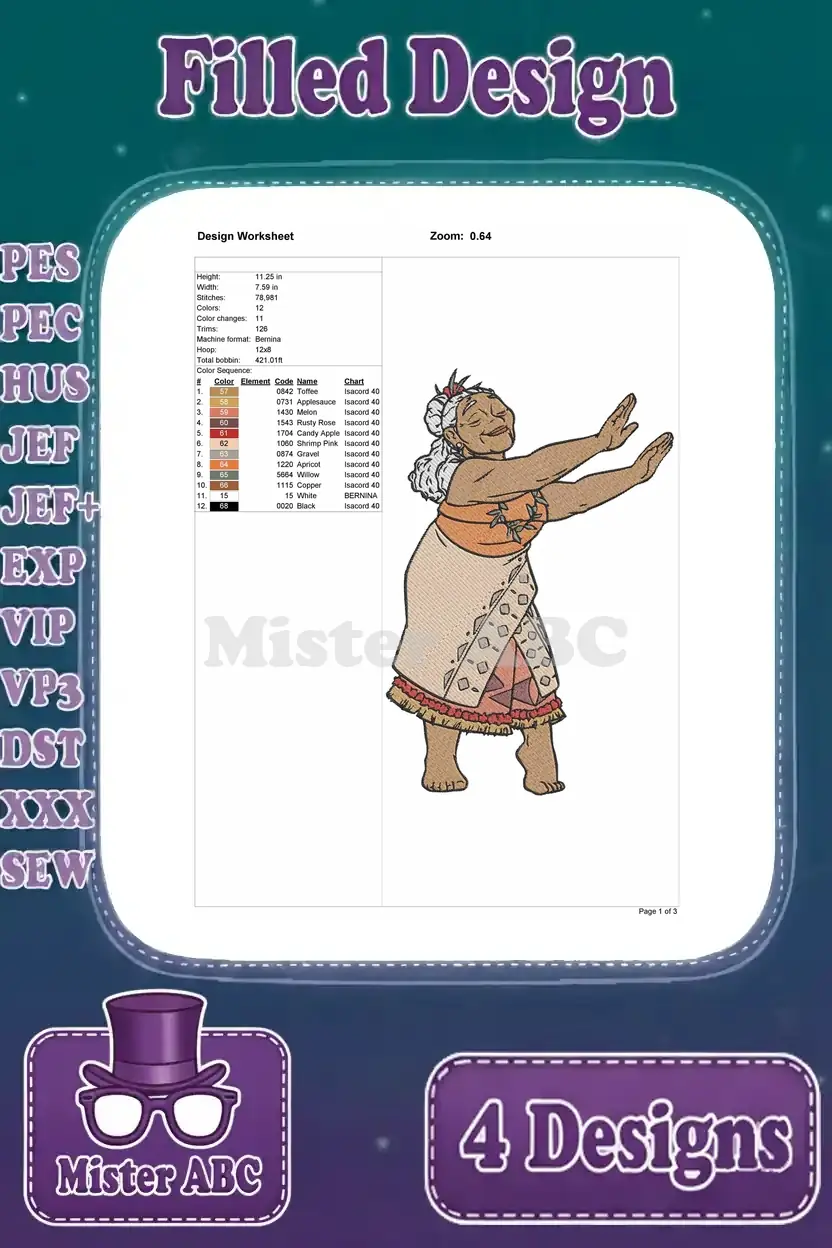 Moana Disney Movie – Maui Demigod – Gramma Tala – Heihei The Rooster – Polynesian Legends – Filled Embroidery Design