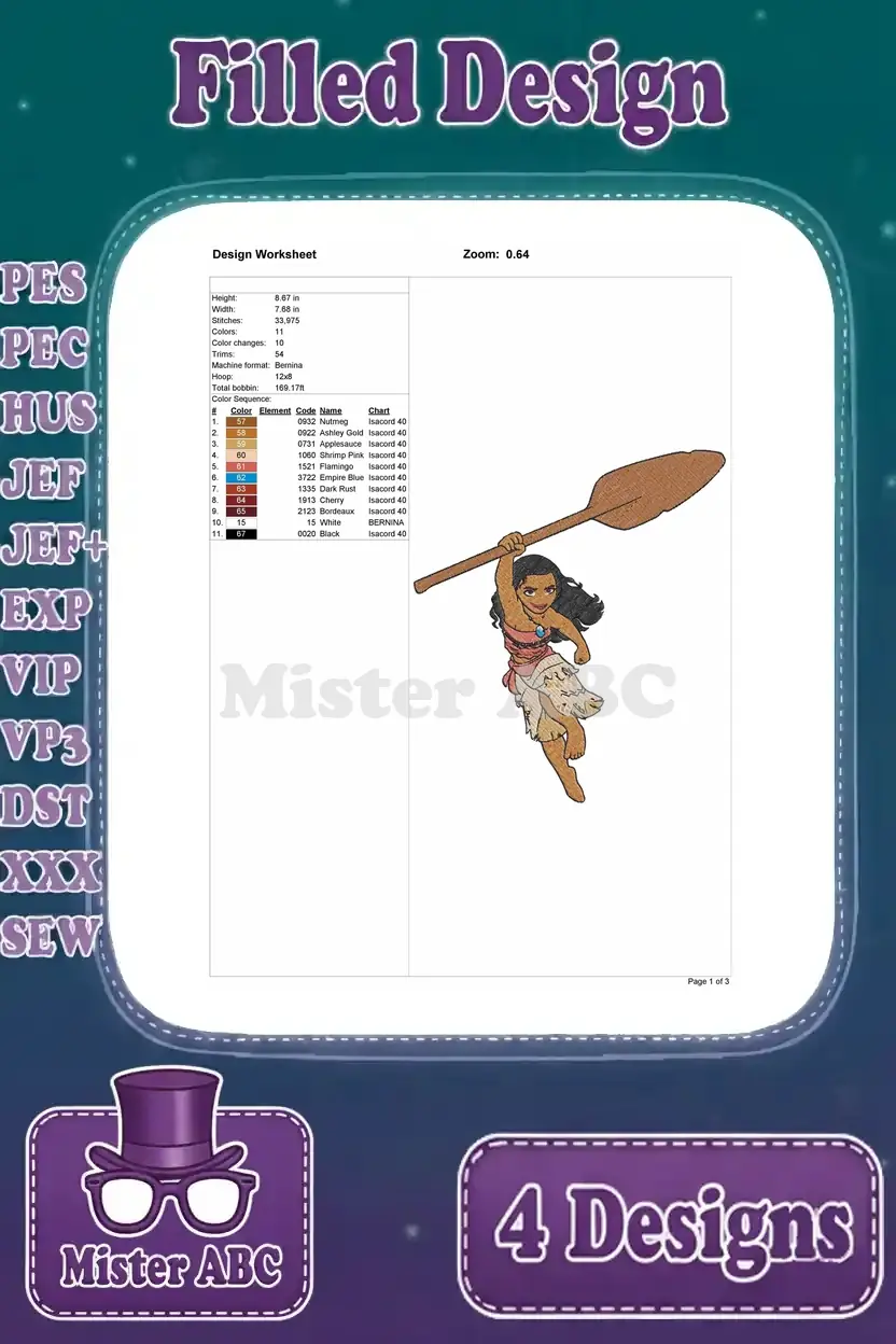 Moana Disney Movie – Moana The Wayfinder – Various Poses With Oar And Dancing – Polynesian Princess – Filled Embroidery Design