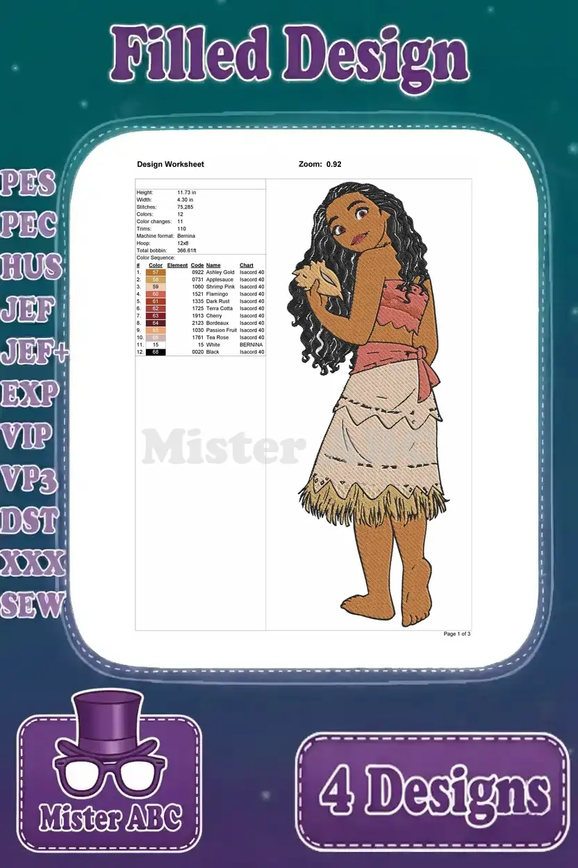 Moana Disney Movie - Moana The Wayfinder - Various Poses With Oar And Dancing - Polynesian Princess - Filled Embroidery Design - 3957