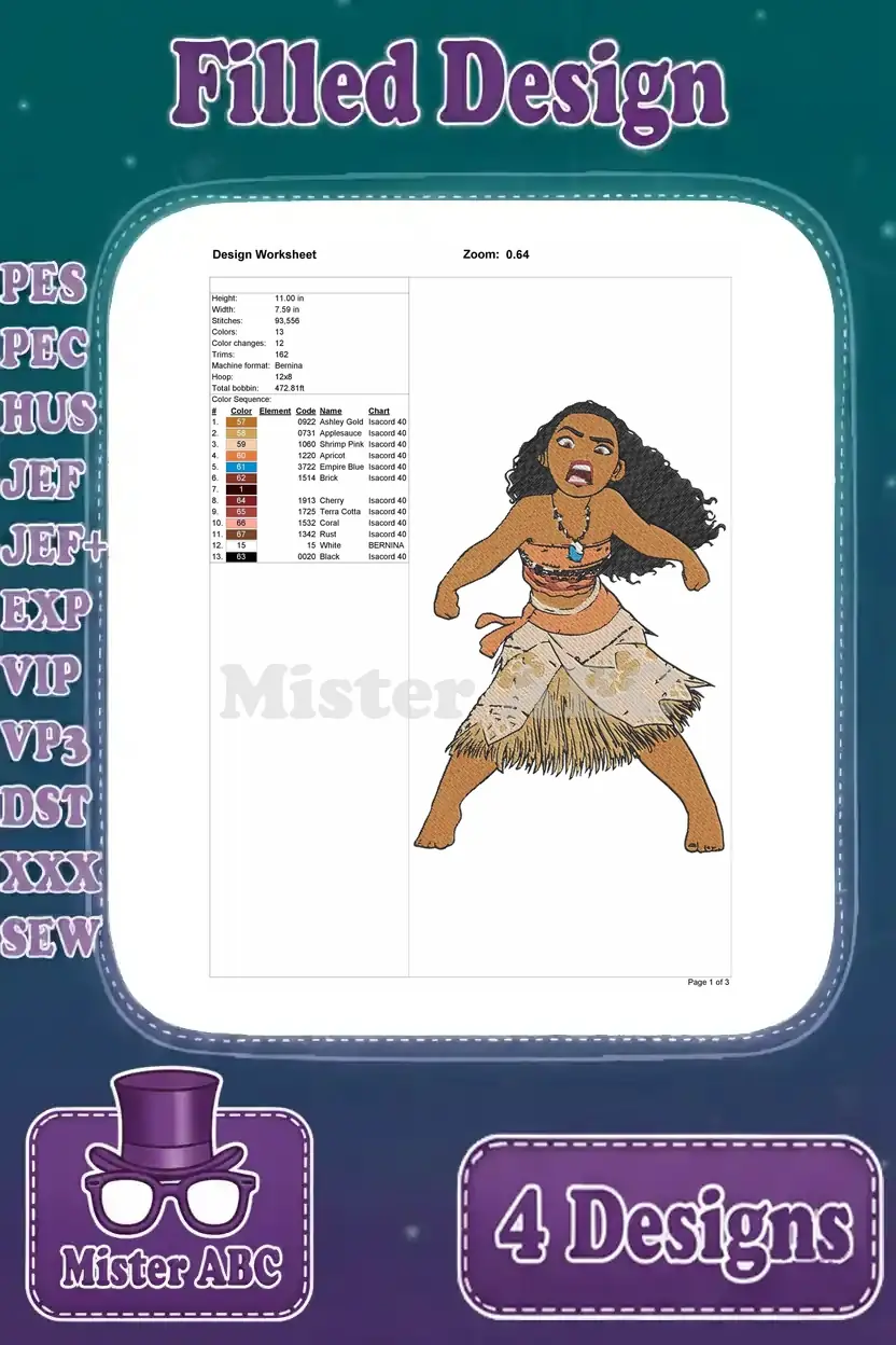 Moana Disney Movie - Moana The Wayfinder - Various Poses With Oar And Dancing - Polynesian Princess - Filled Embroidery Design - 3958