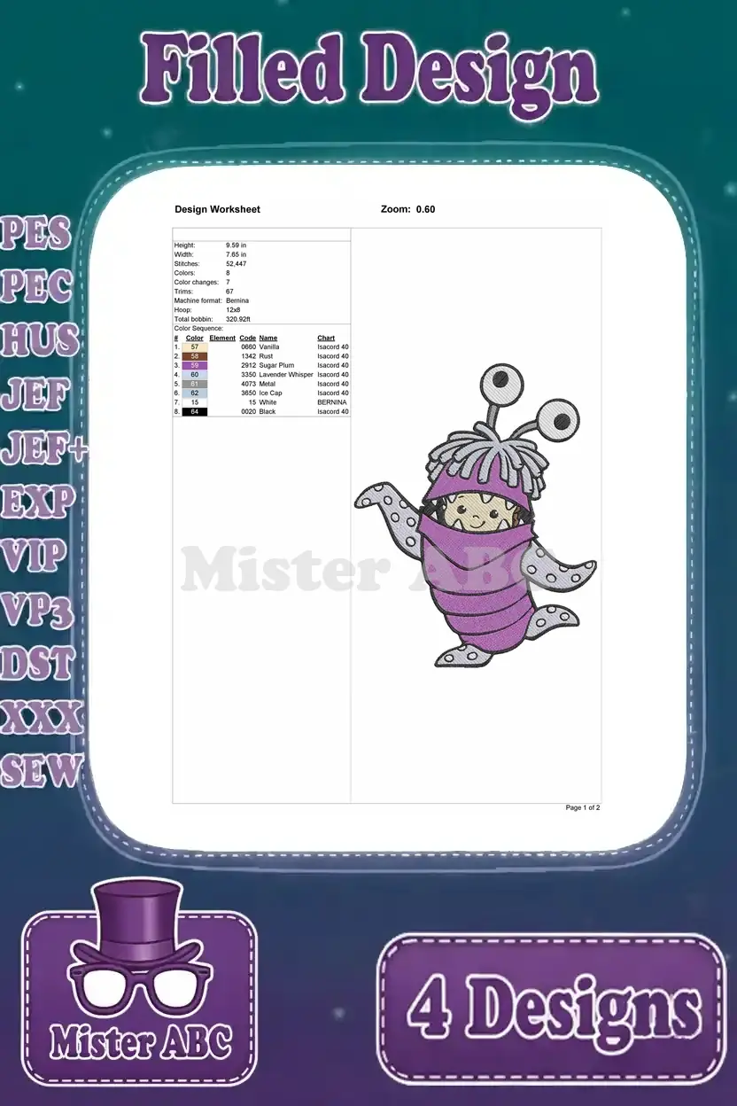 Delightful Boo embroidery bundle! Four charming Monsters, Inc. designs capturing her adorable poses and monster costume.