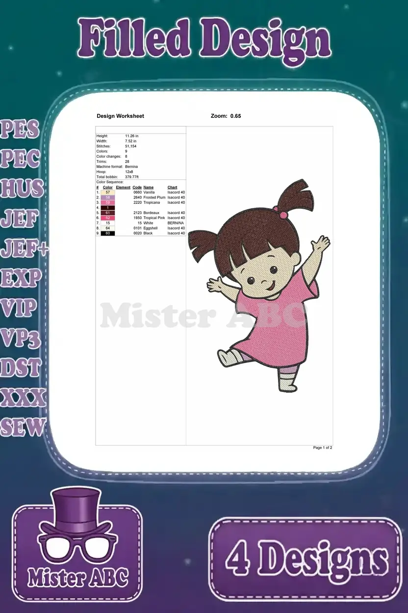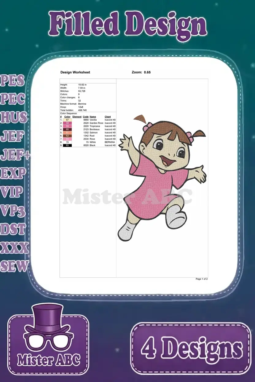 Monsters Inc – Boo Mary Gibbs Human Child – Cute And Playful Poses – Pixar Character Collection – Filled Embroidery Design