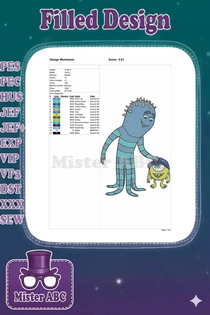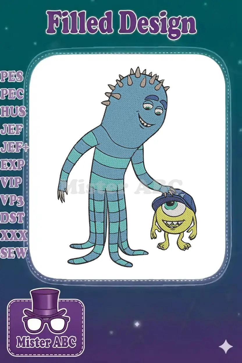 Monsters Inc inspired blue spiky monster and Mike embroidery designs