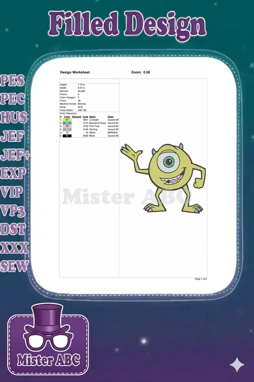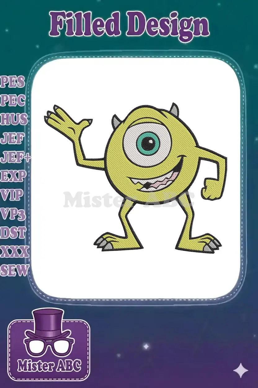 Bring laughter and monster fun to your projects with this vibrant Mike Wazowski embroidery design.