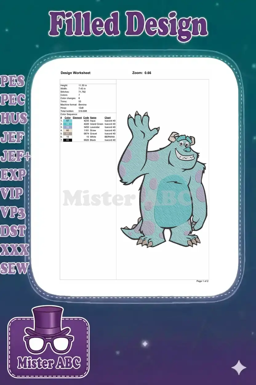 Monsters Inc Sulley blue furry monster waving embroidery designs