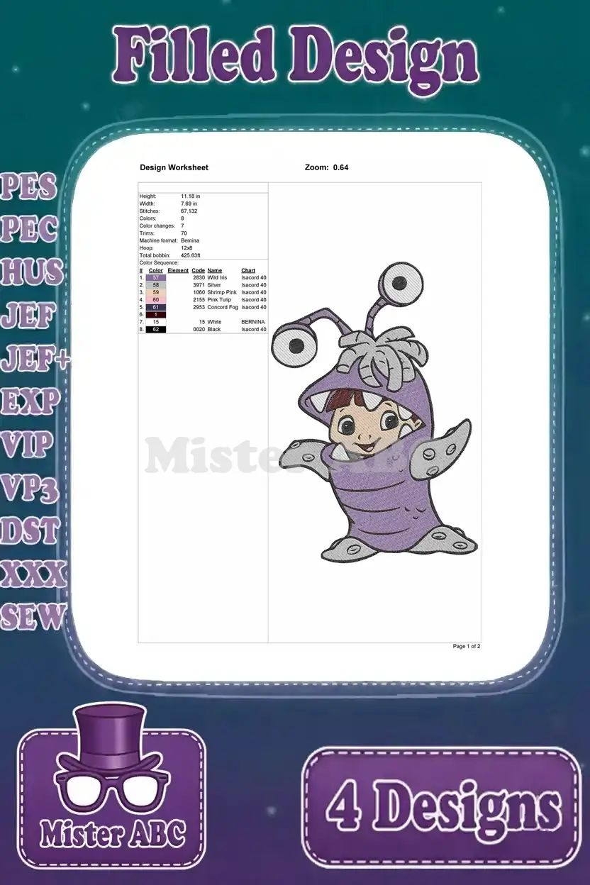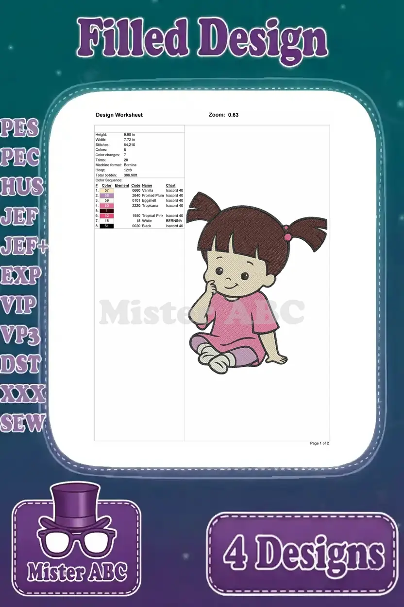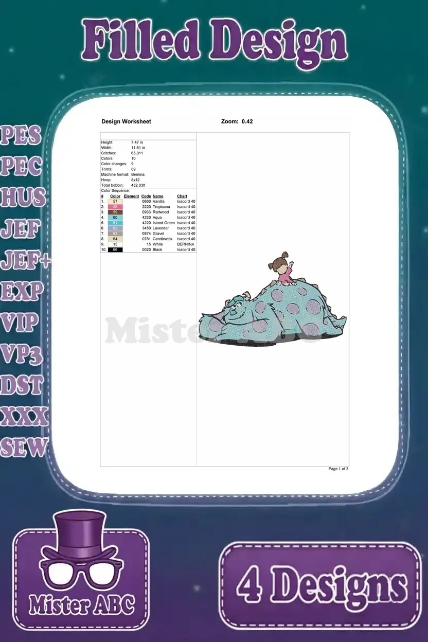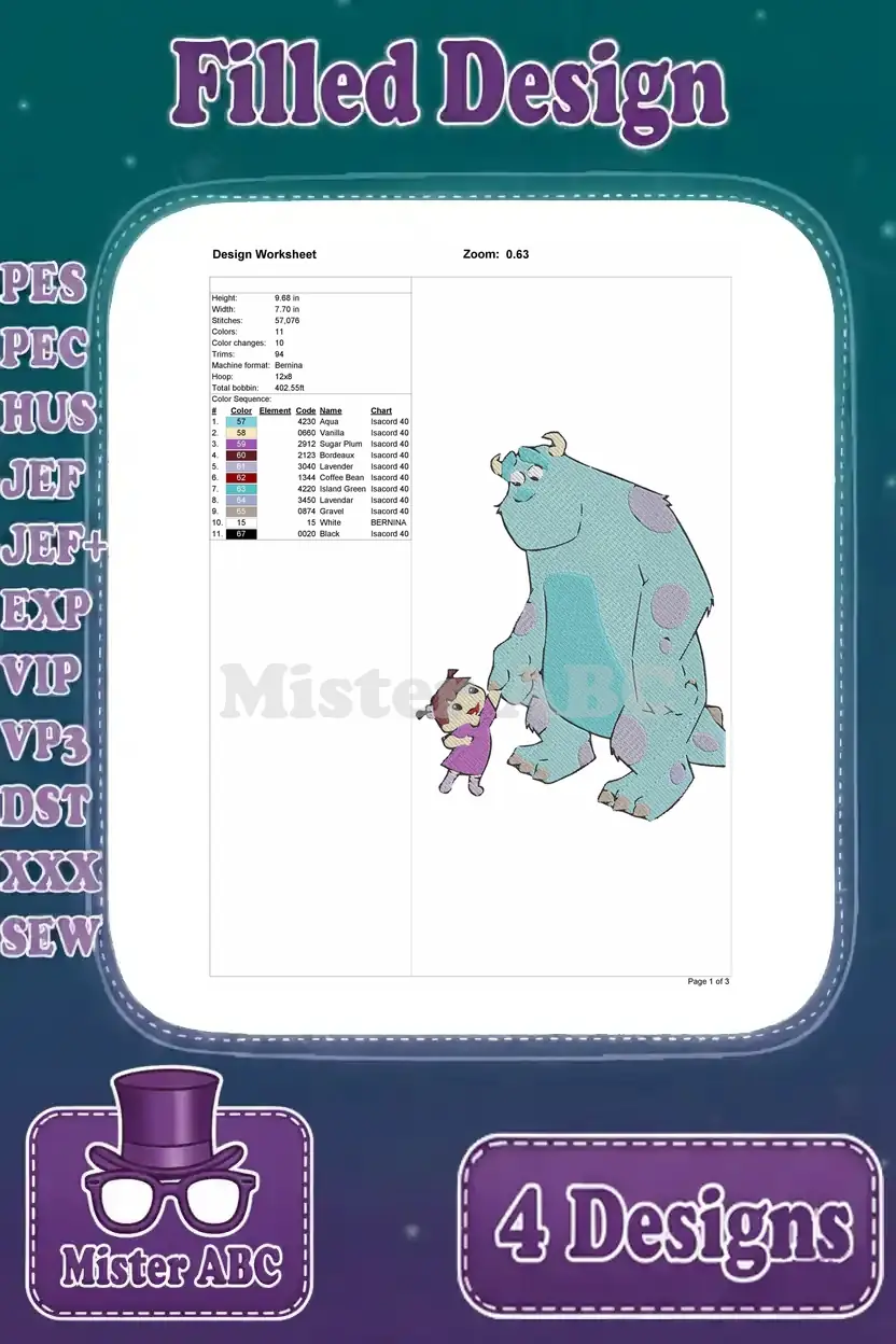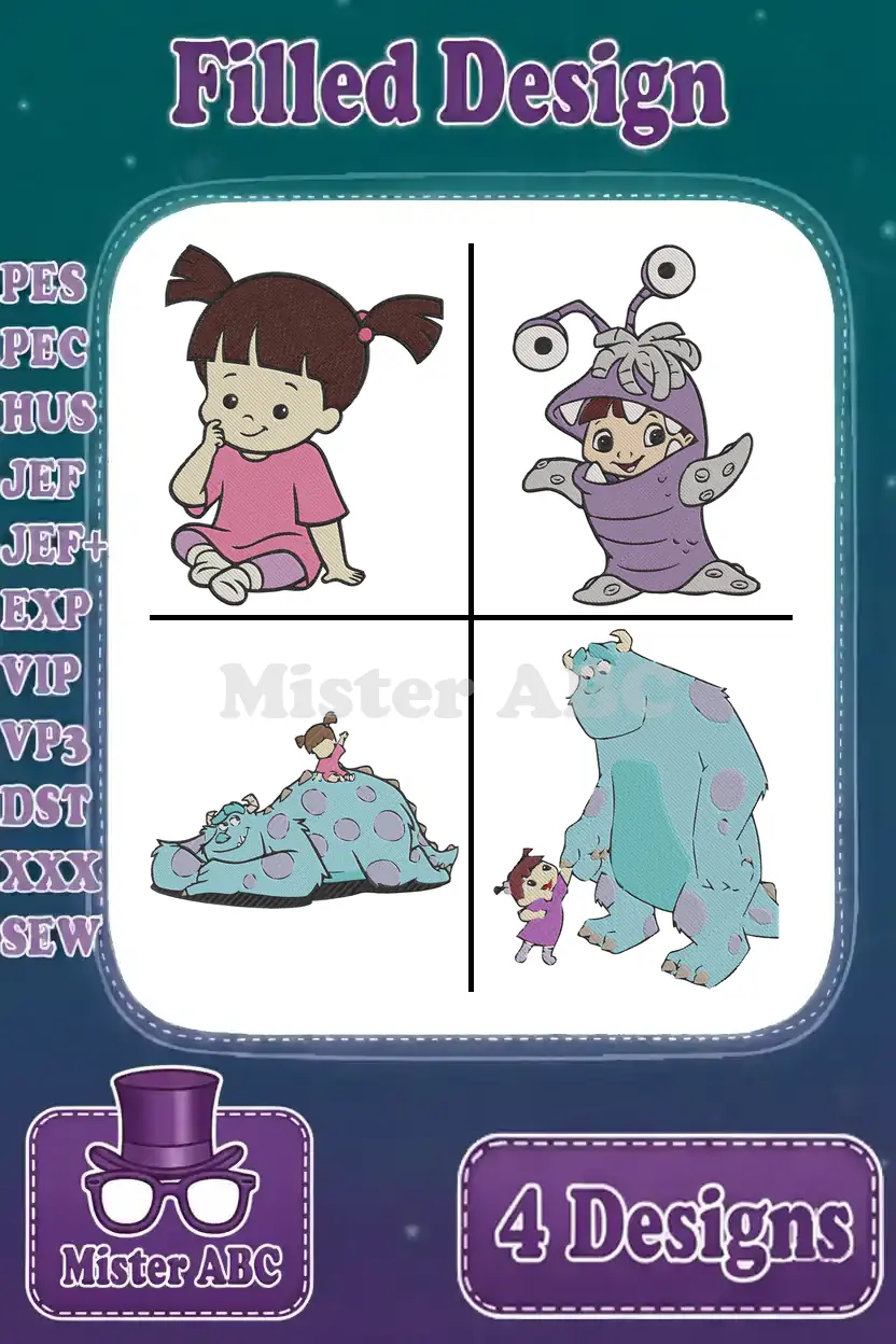Monsters Inc – Sulley James P Sullivan And Boo Human Child – Gentle Giant And Little Girl Pack – Filled Embroidery Design