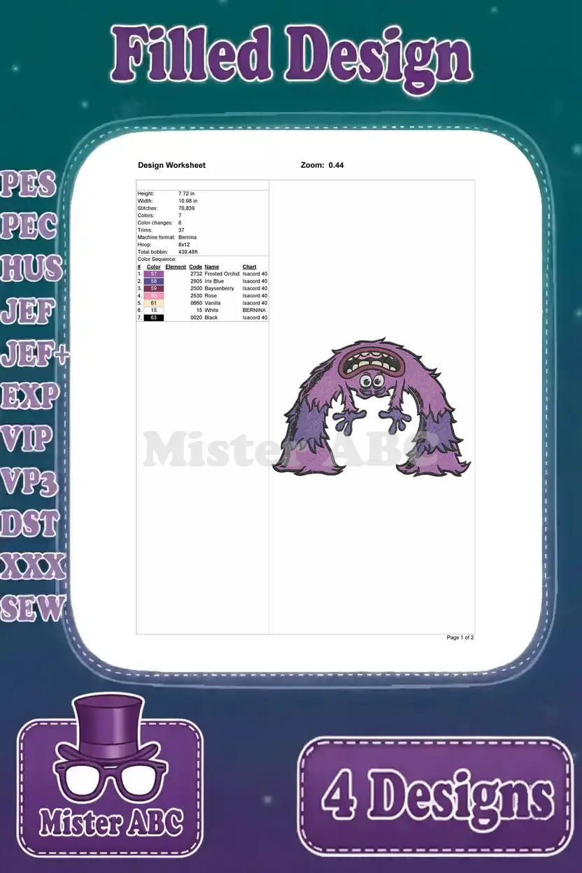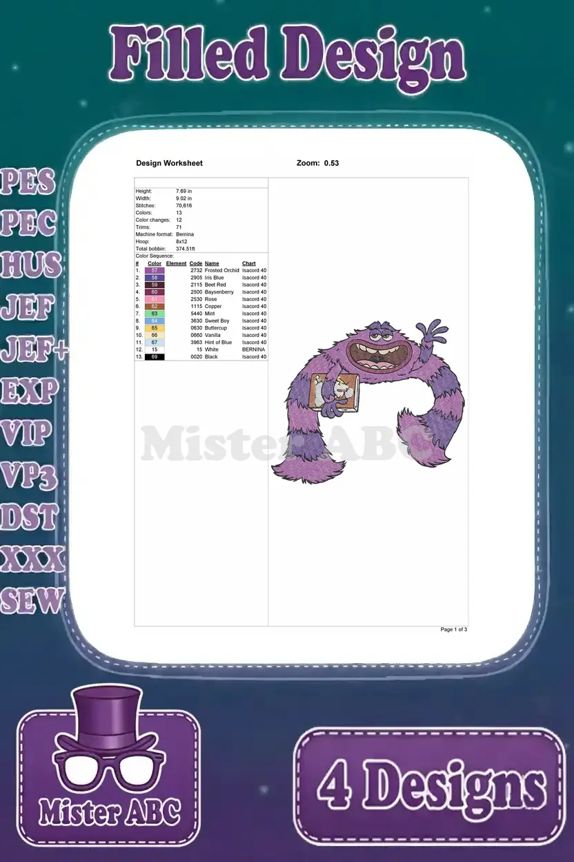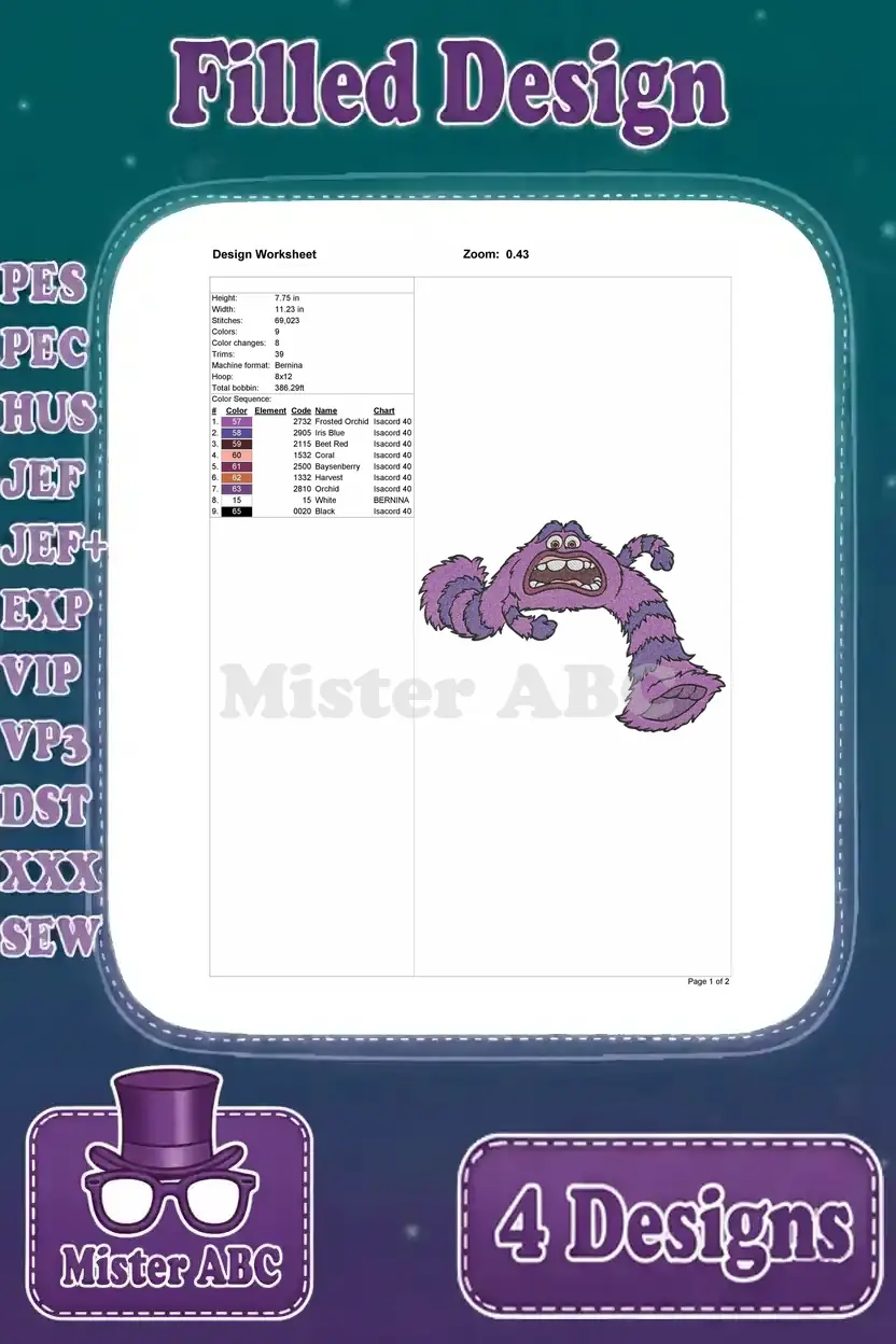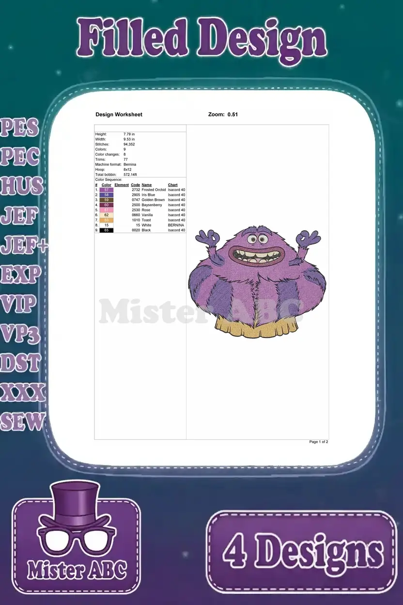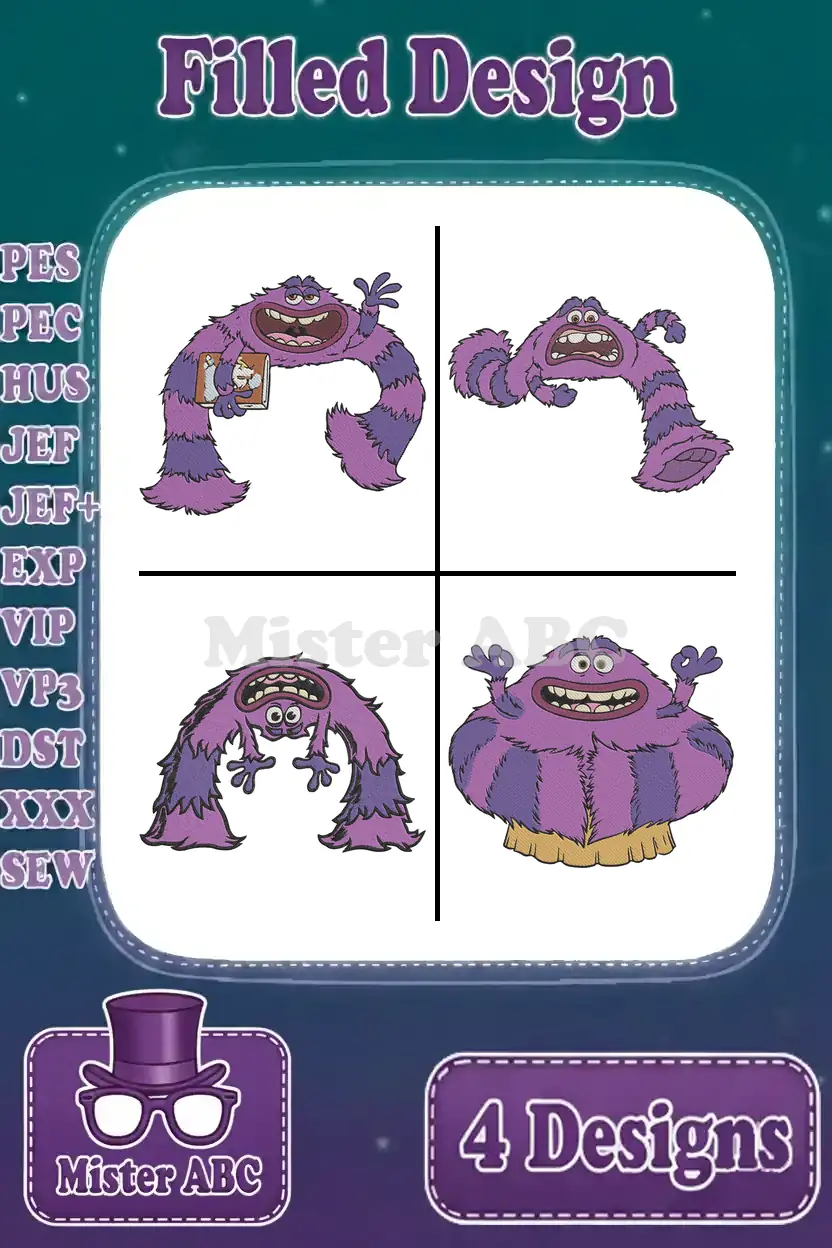 Monsters Inc – Thaddeus Bile Purple Monster – Scary Poses From Scarer Training – Pixar Character – Filled Embroidery Design