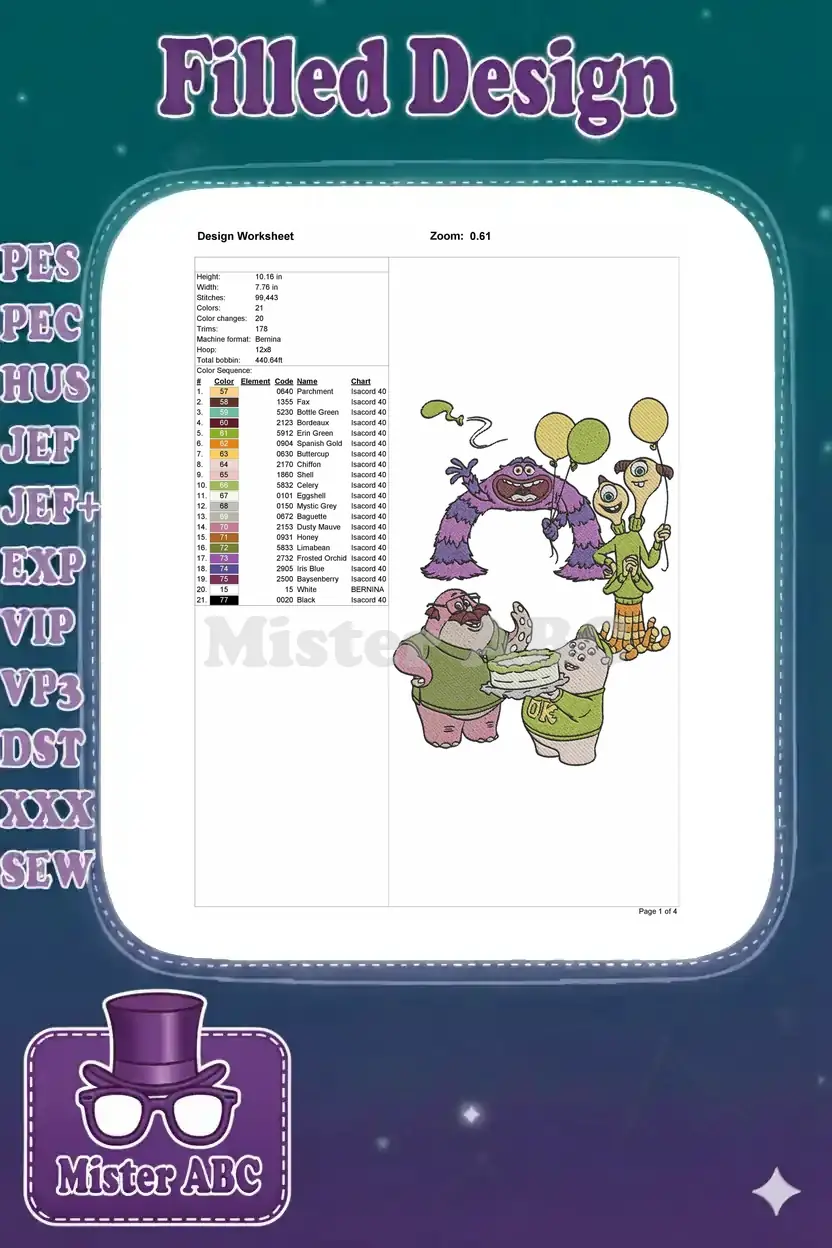 Monsters University Oozma Kappa friends celebrating with cake and balloons embroidery designs