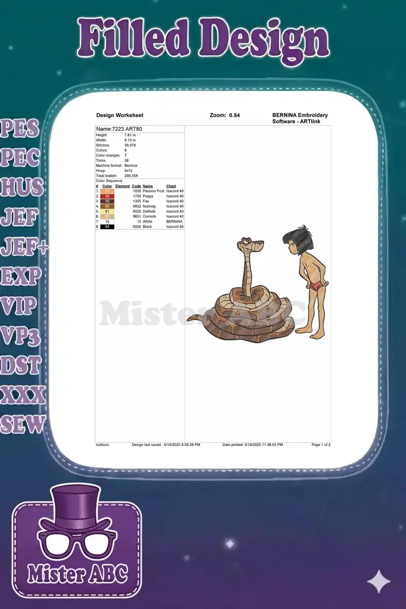Mowgli and Kaa snake jungle cartoon embroidery designs