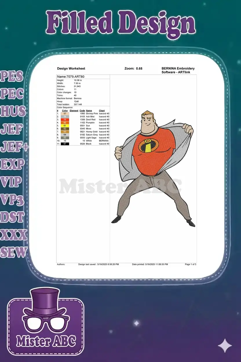 Mr Incredible revealing superhero suit embroidery designs – Disney Pixar character