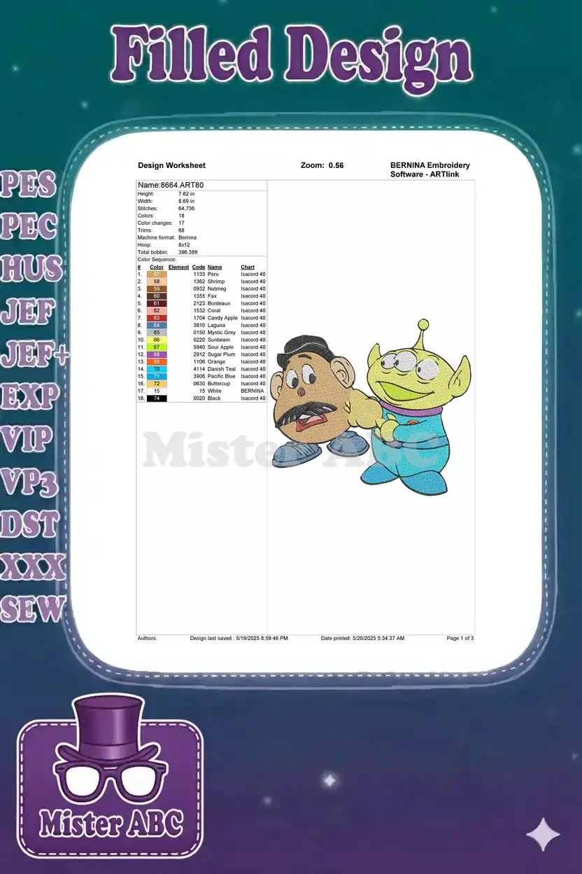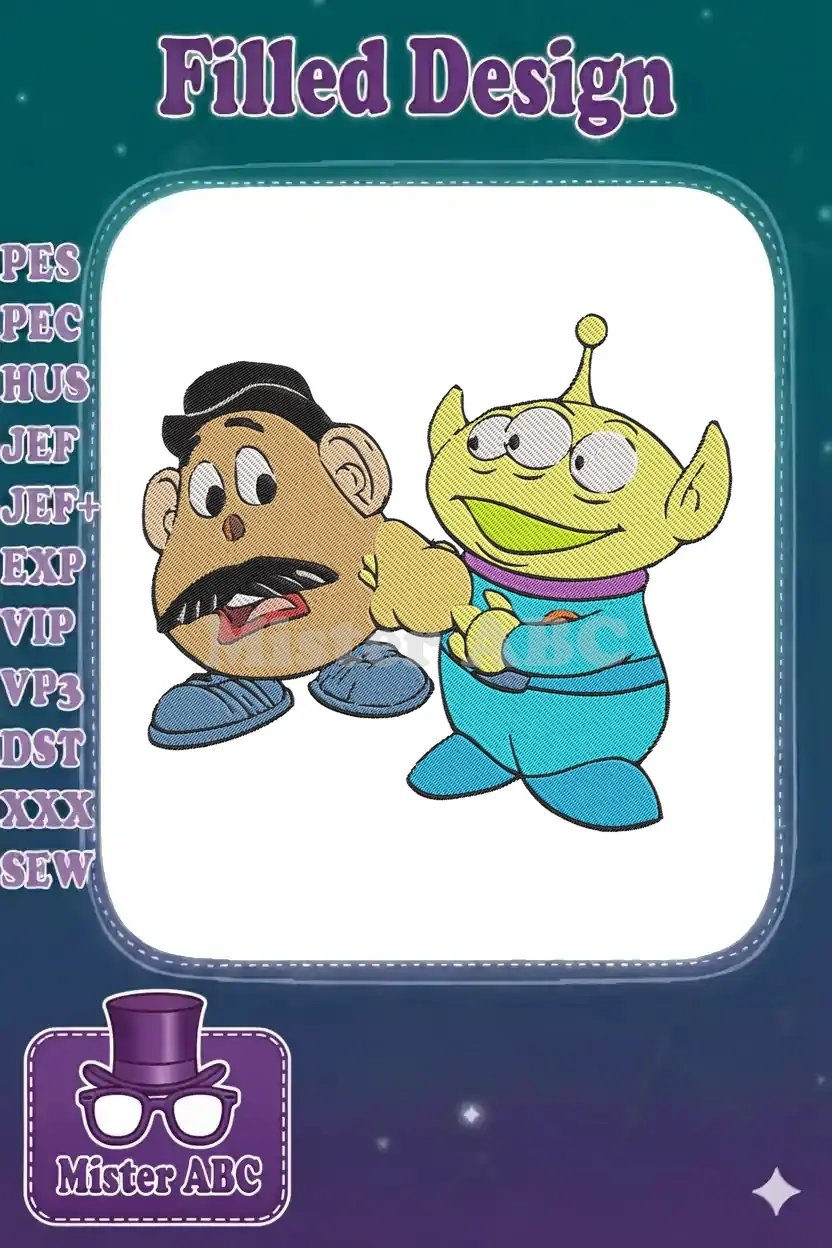 Bring the magic of Toy Story to life with this delightful embroidery featuring Mr. Potato Head and a friendly Alien!