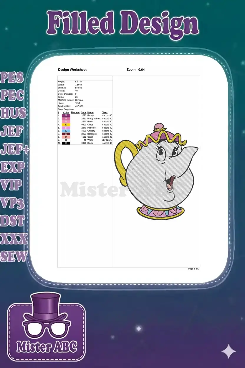 Mrs. Potts Disney Teapot character happy embroidery designs
