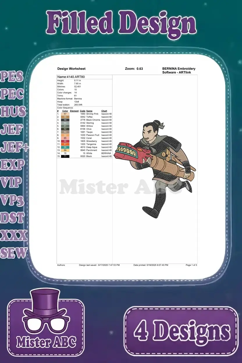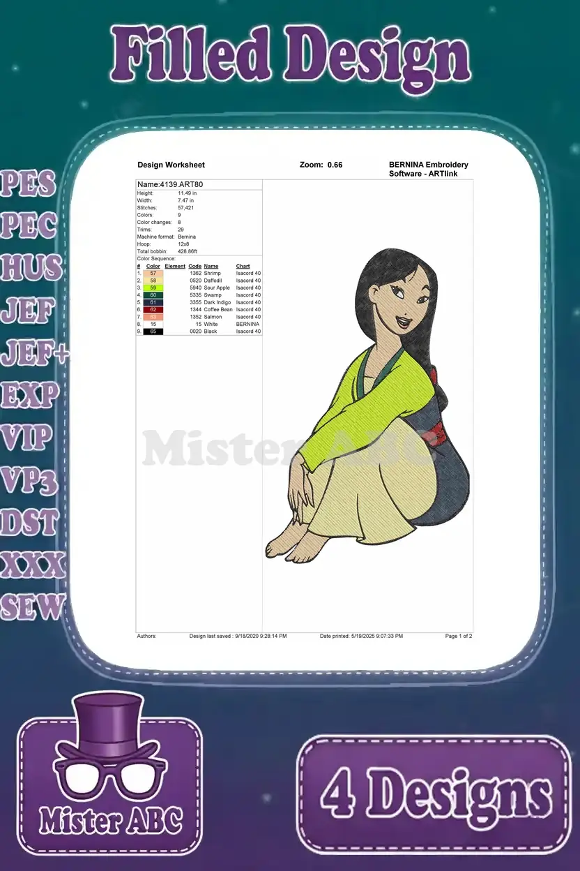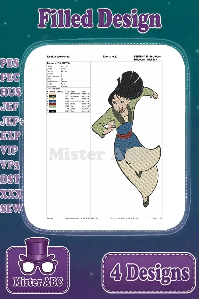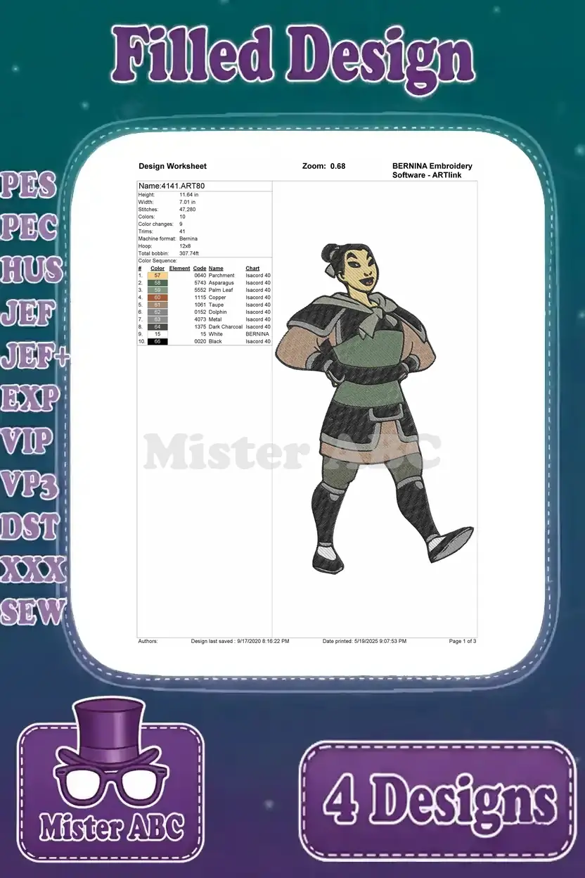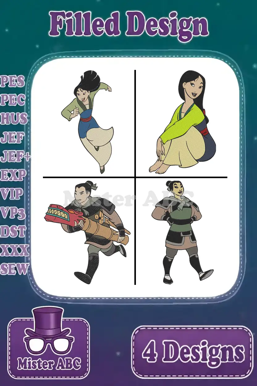 Mulan As Ping Li Shang Warrior Mulan In Armor And With Sword Poses – Filled Embroidery Design