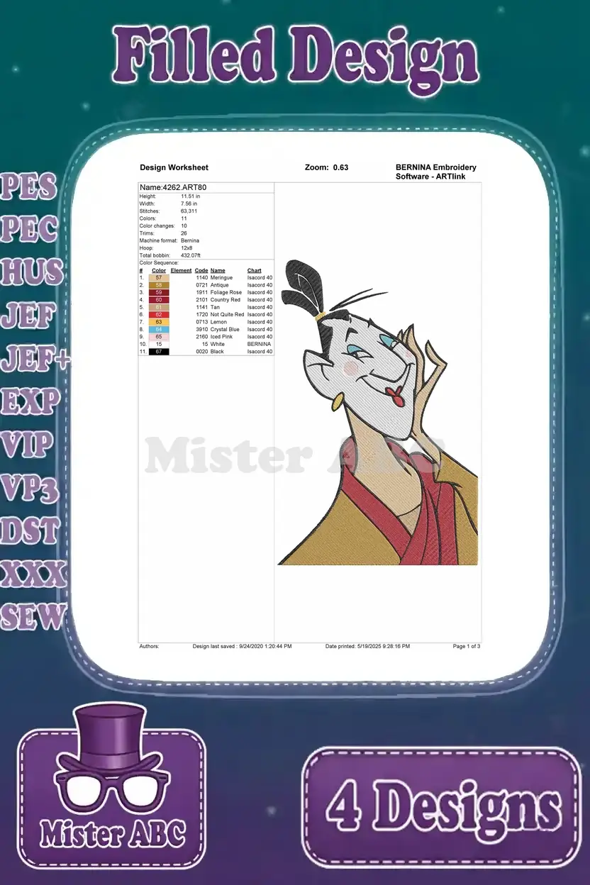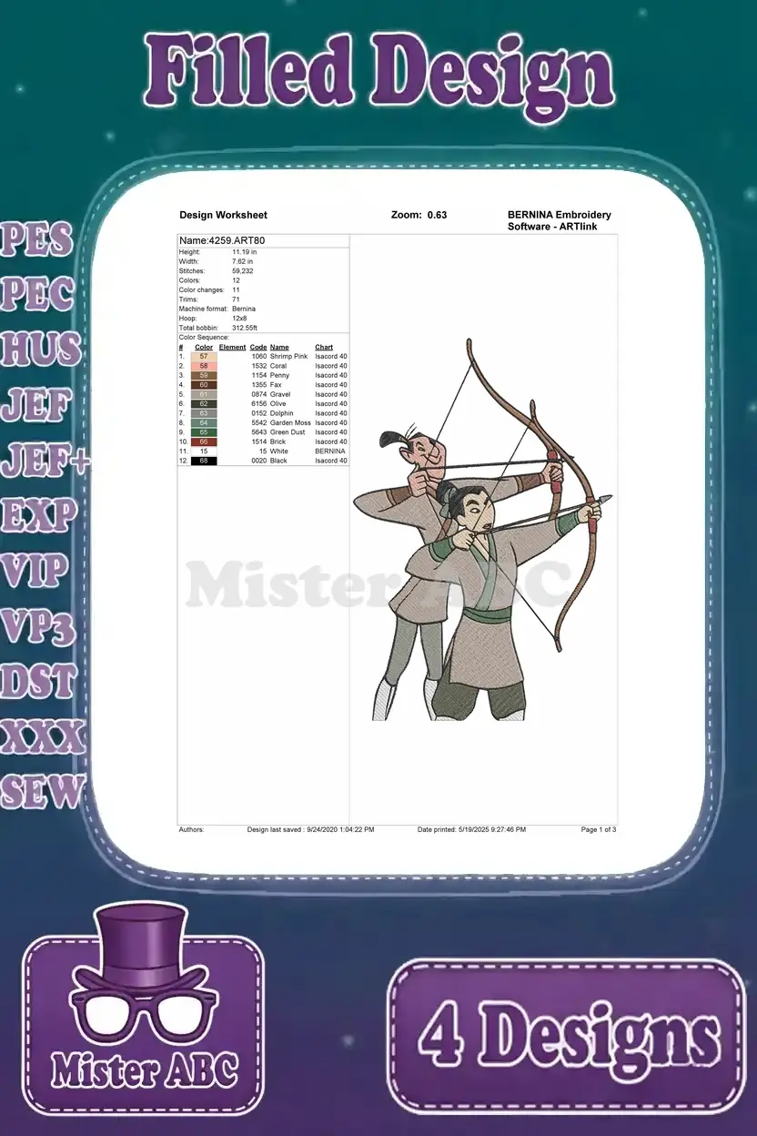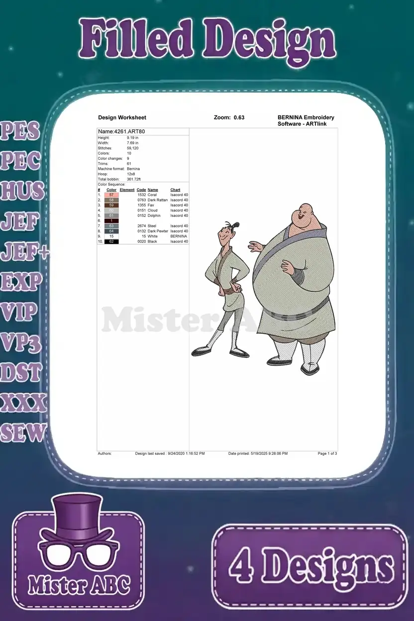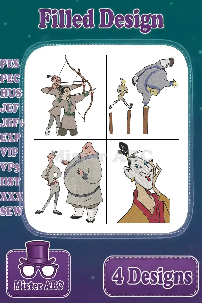 Bring the legendary tale of Mulan to life with this vibrant 4-design embroidery bundle, featuring beloved characters. Perfect for fans!