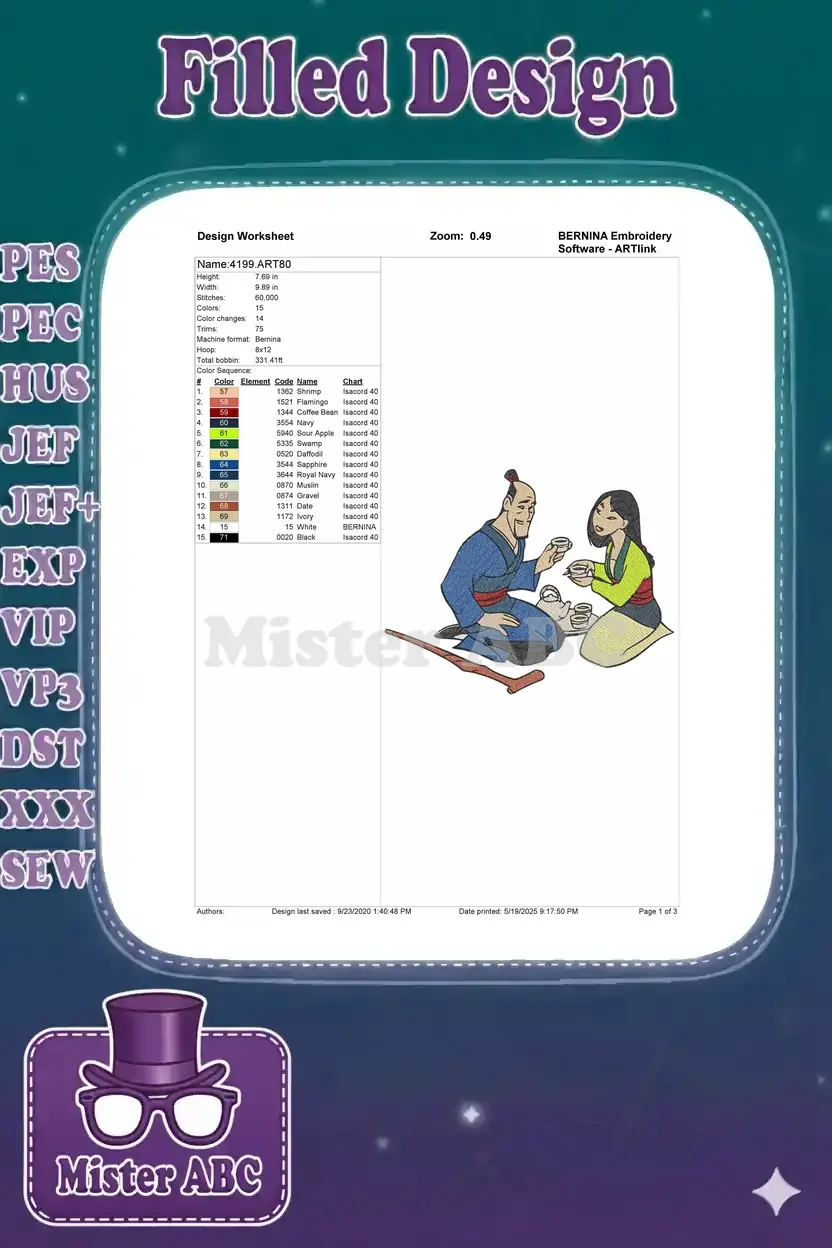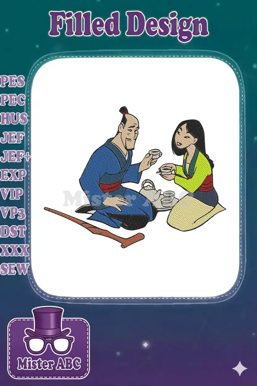 Mulan and Father Sharing Tea Ceremony Embroidery Designs