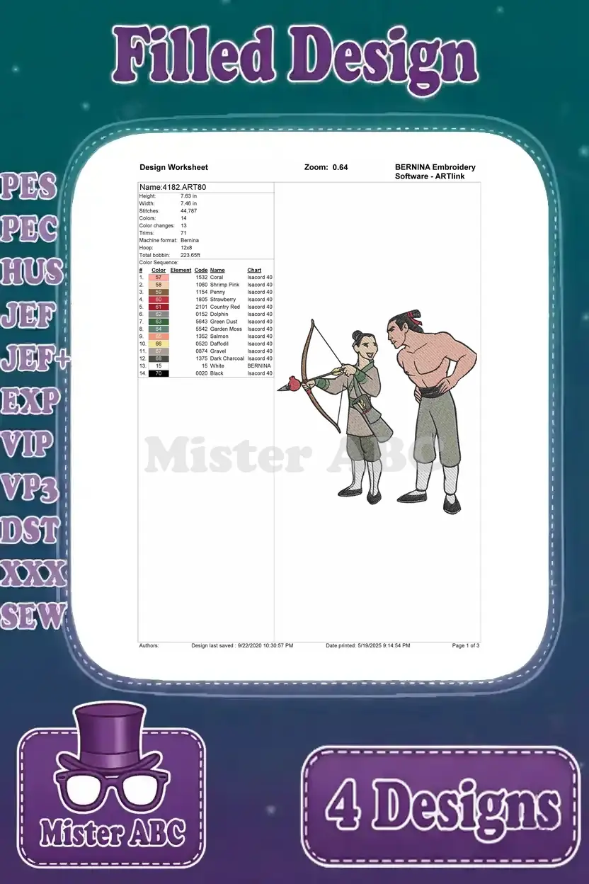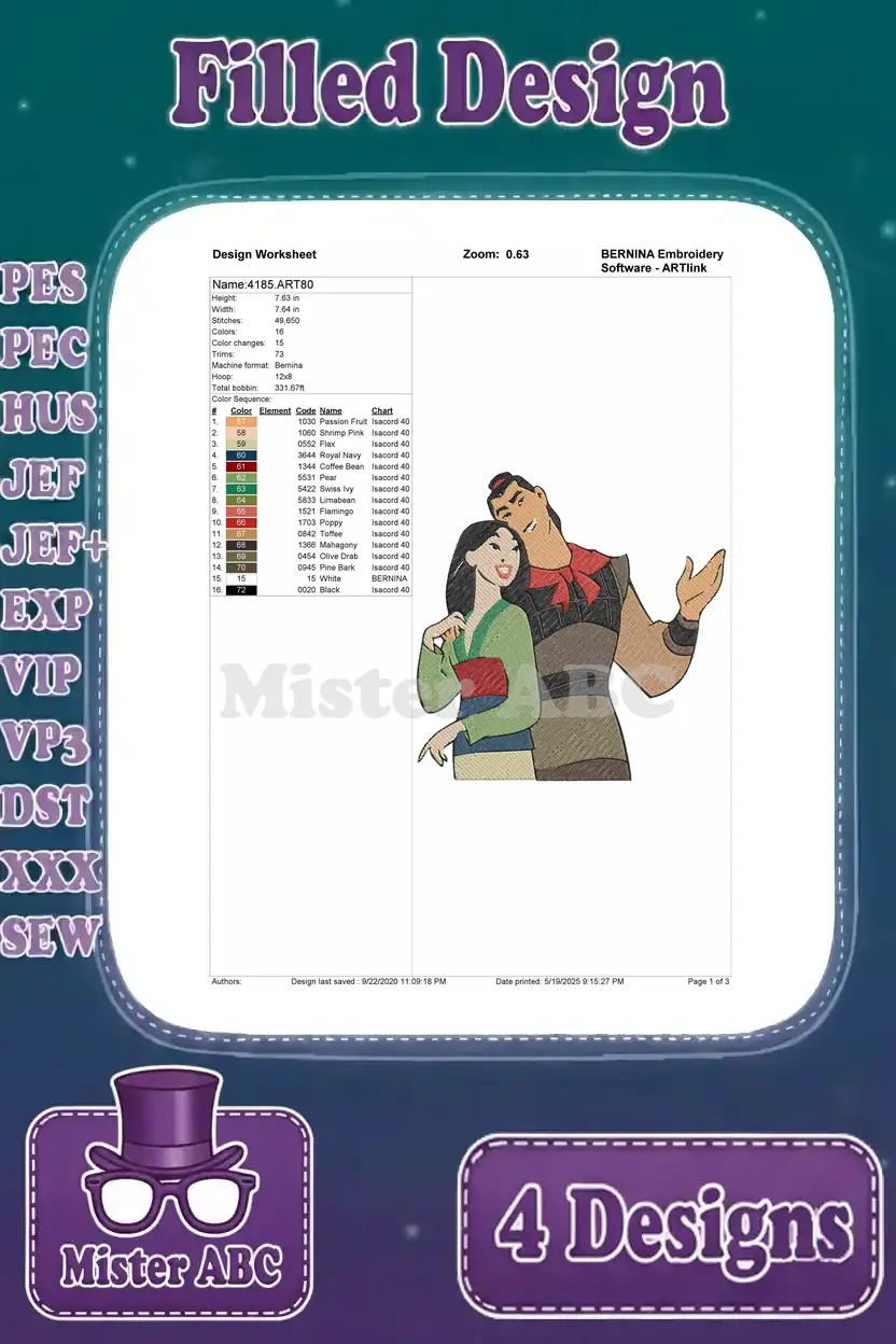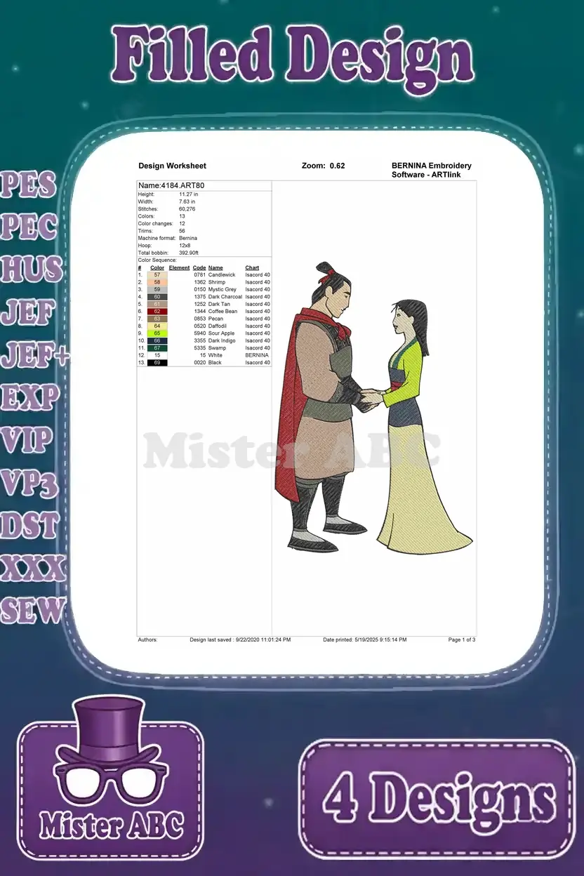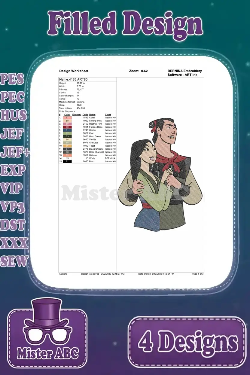Discover four exquisite Mulan & Li Shang embroidery designs, perfect for fans! Each filled design captures iconic moments, offering versatile creative projects.