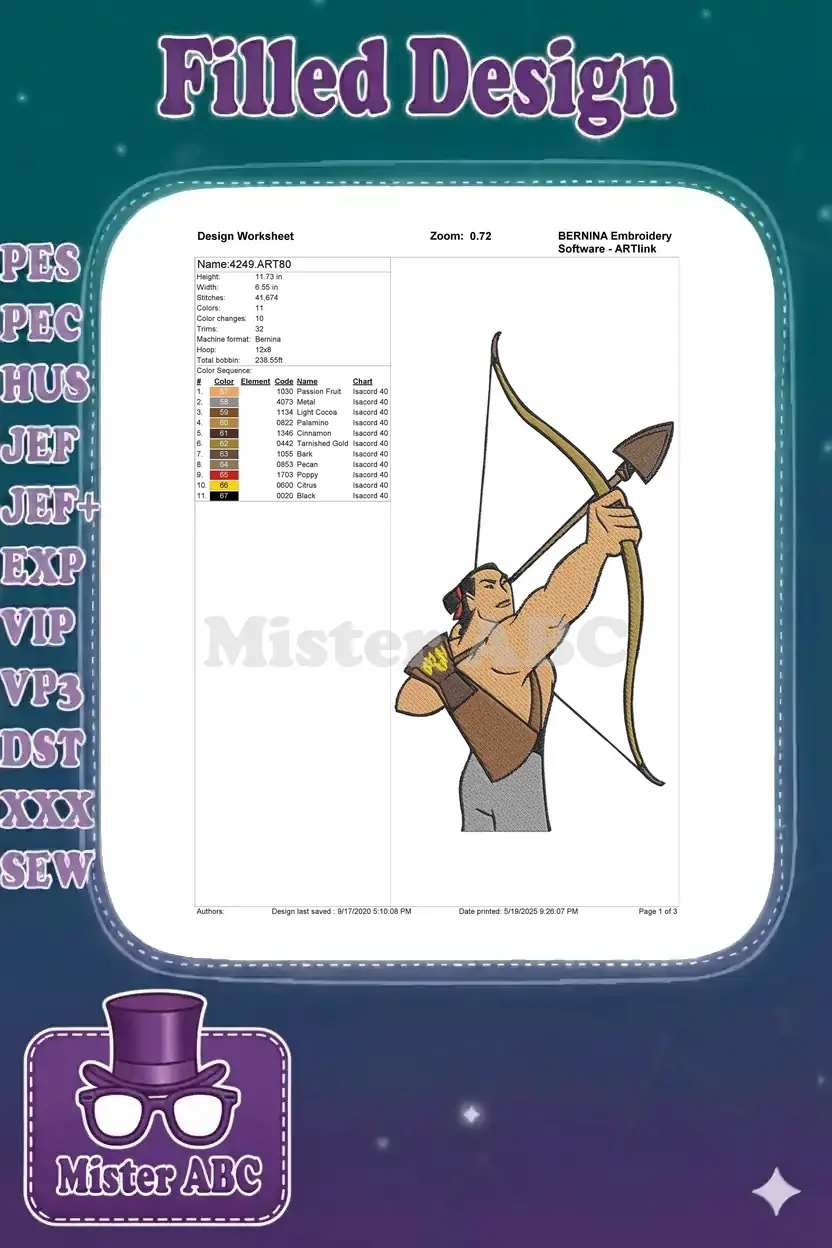 Unleash the hero within with this striking Li Shang embroidery design. Perfect for fans of Mulan and archery themes, adding a touch of adventure to any project. A powerful and detailed stitch art.