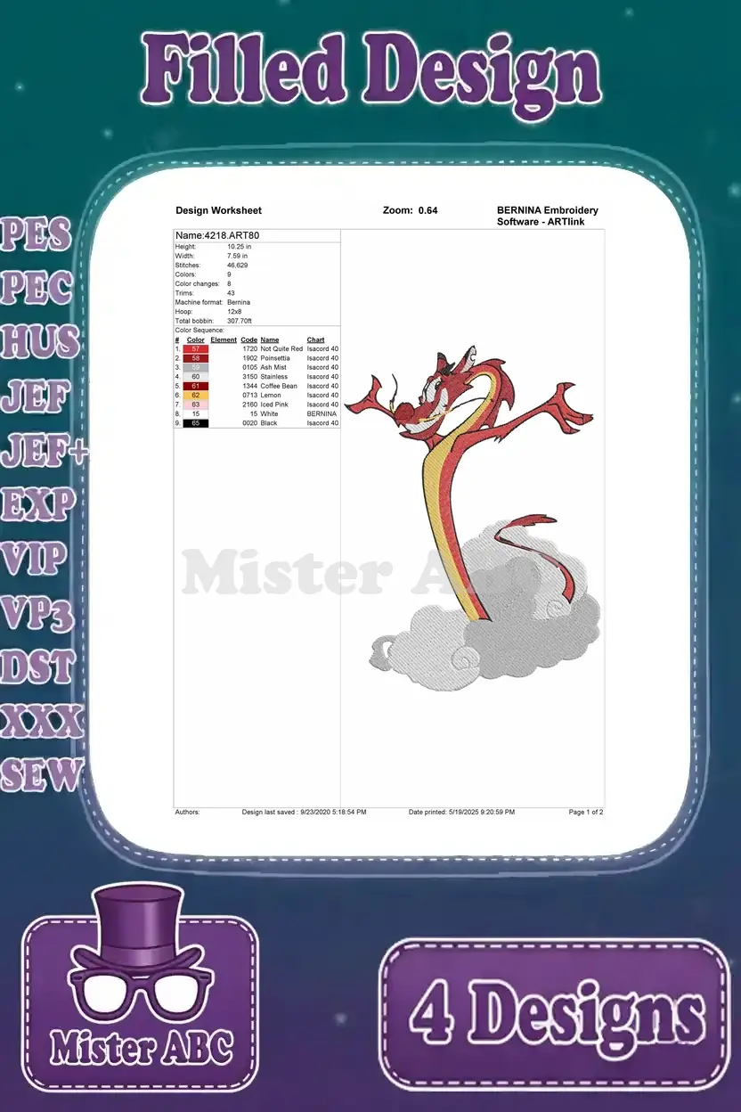 Mulan Mushu Dragon With Lantern On Tree Branch With Drum And On Cloud Flying – Filled Embroidery Design