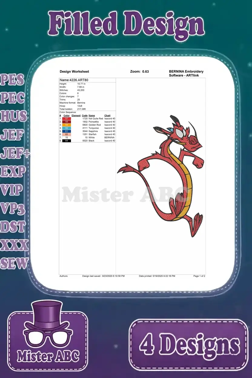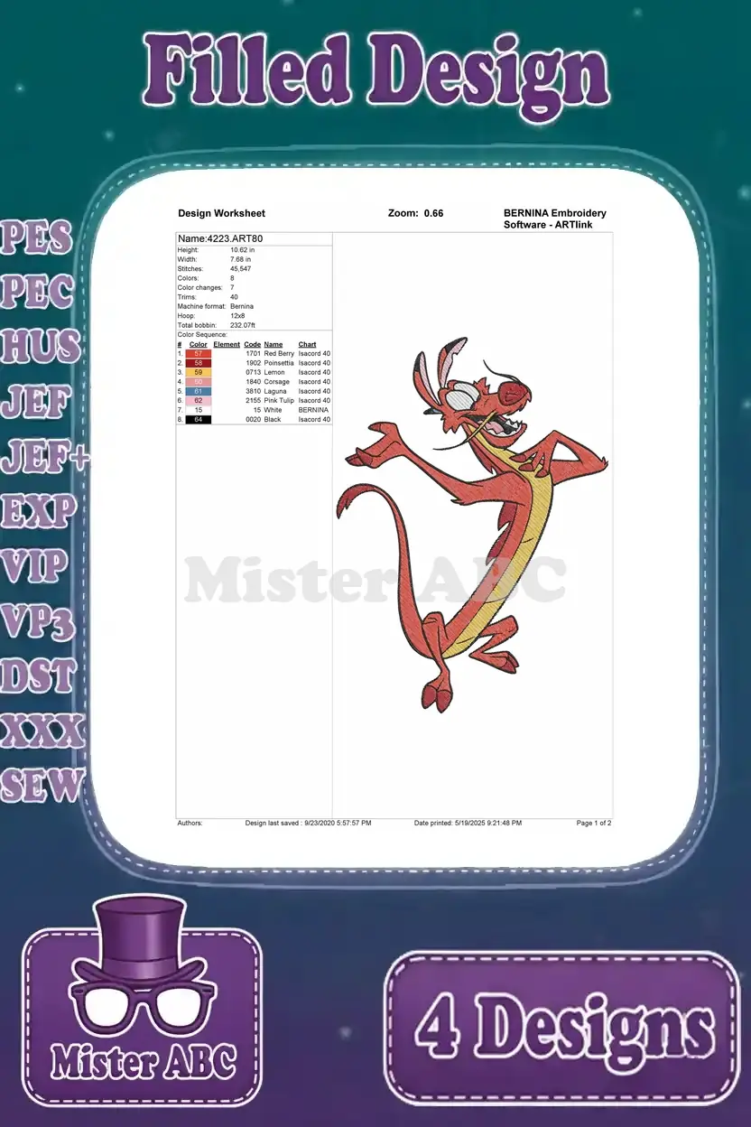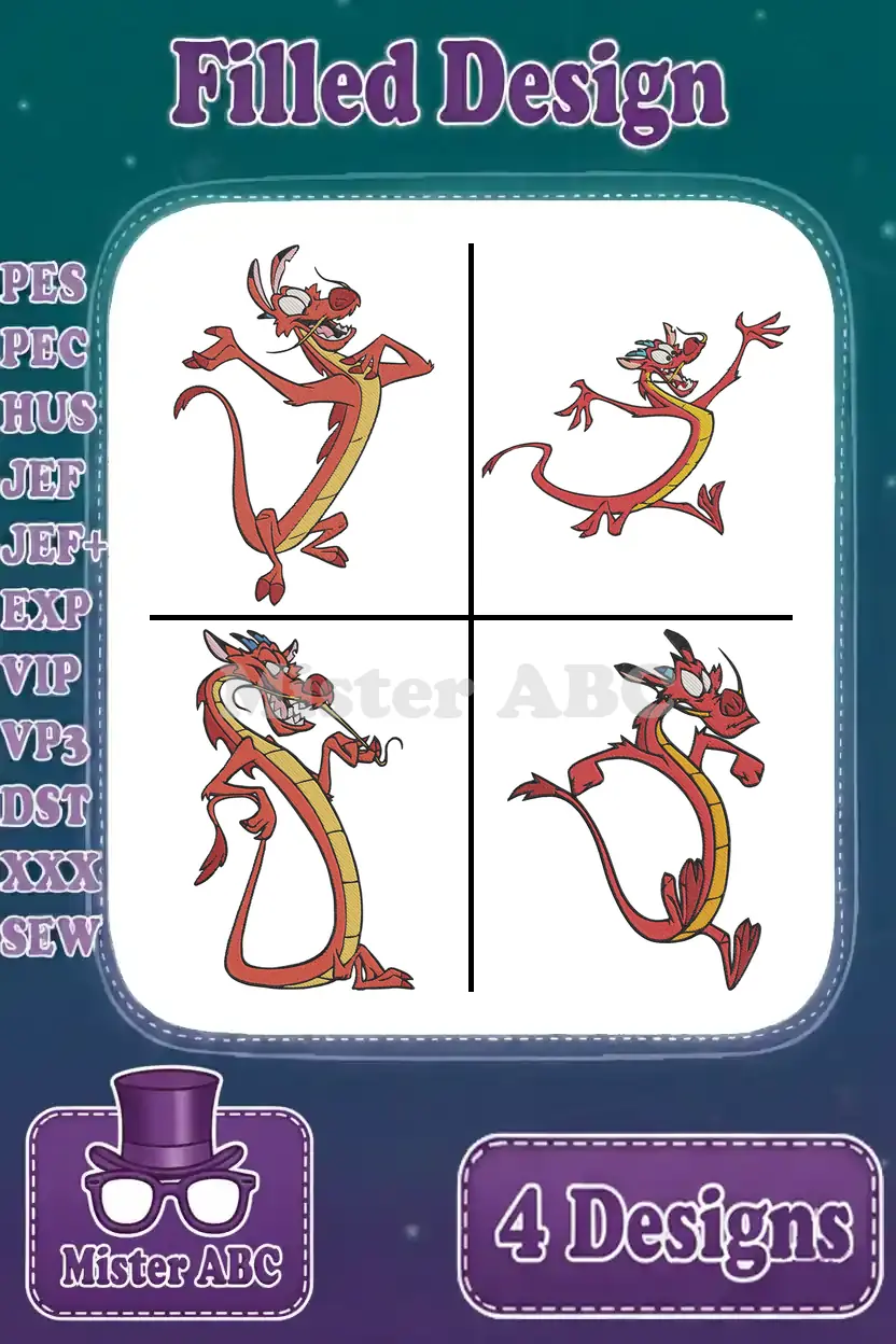 Mulan Mushu Dragon Various Standing Expressive And Dynamic Character Poses – Filled Embroidery Design
