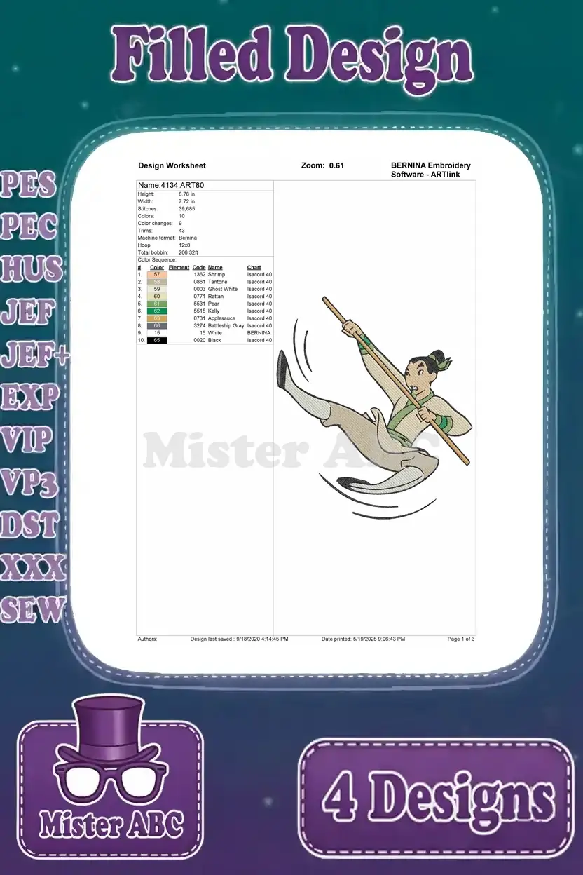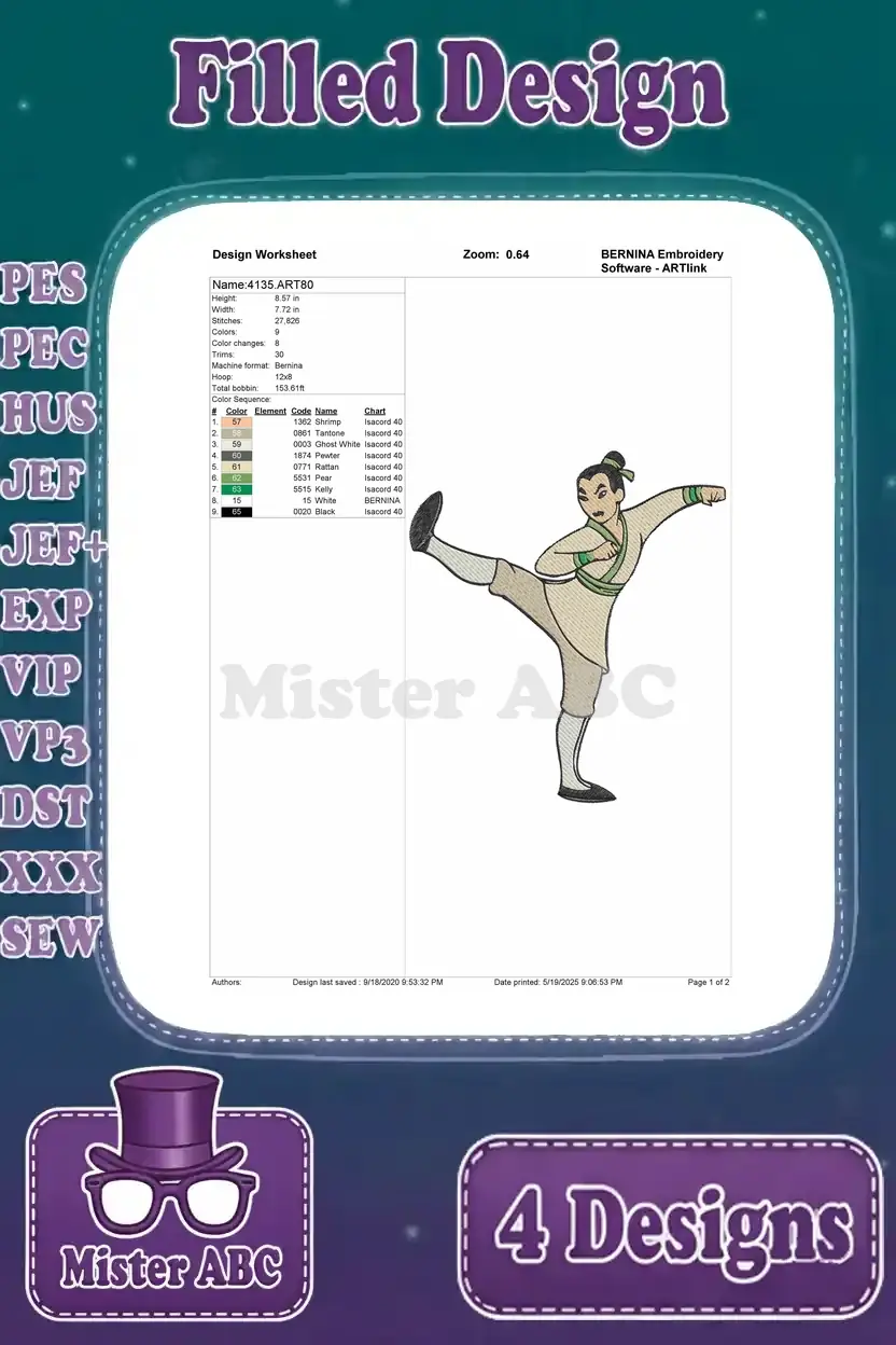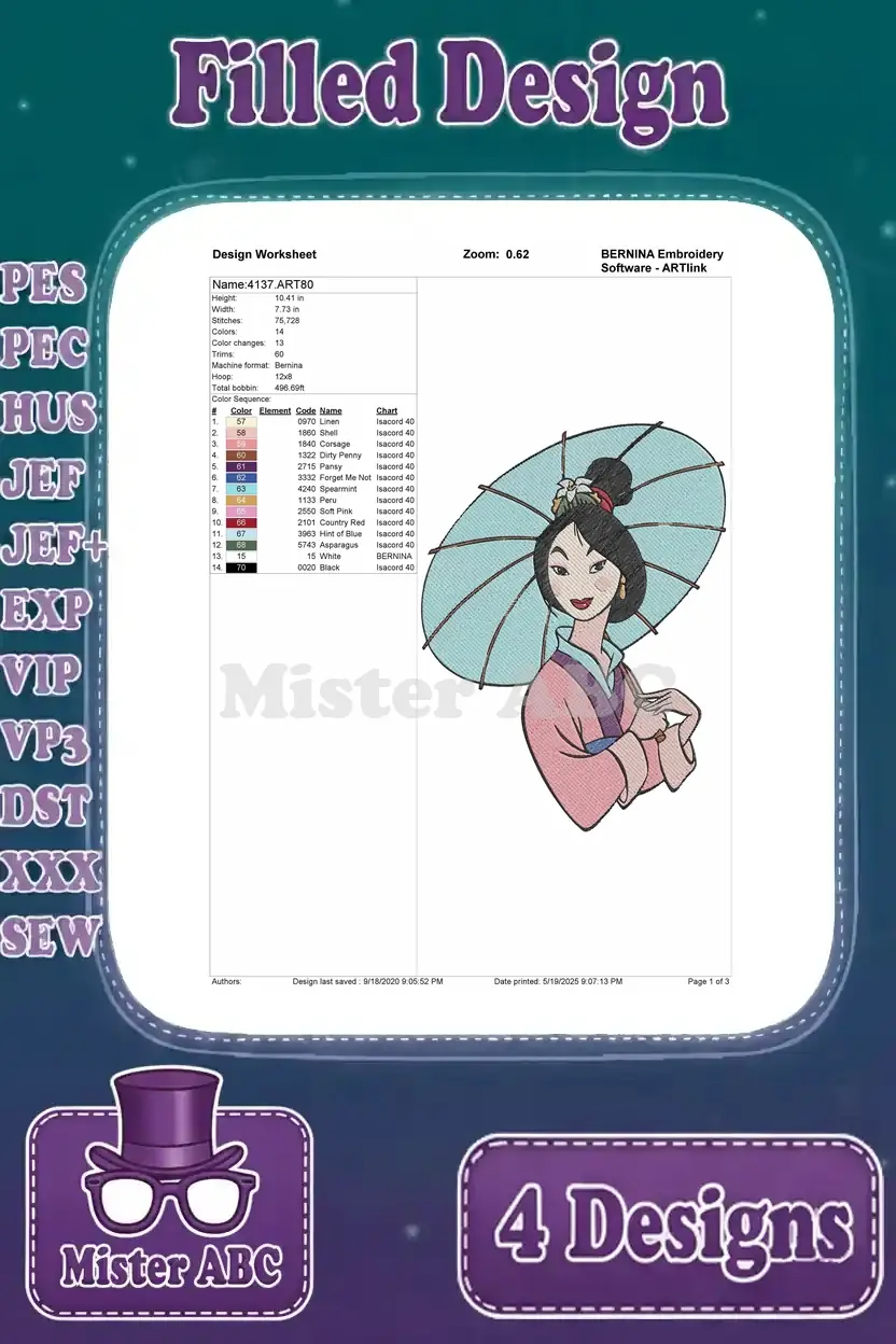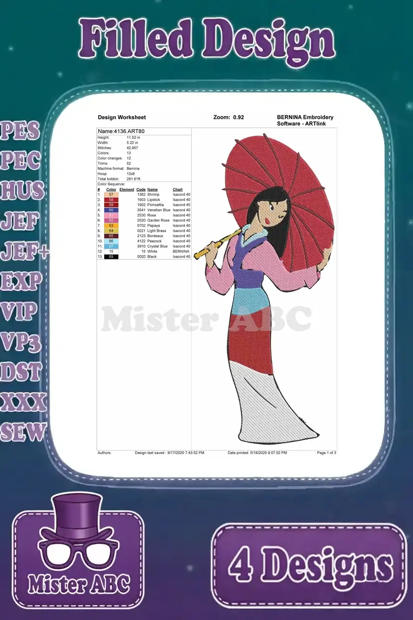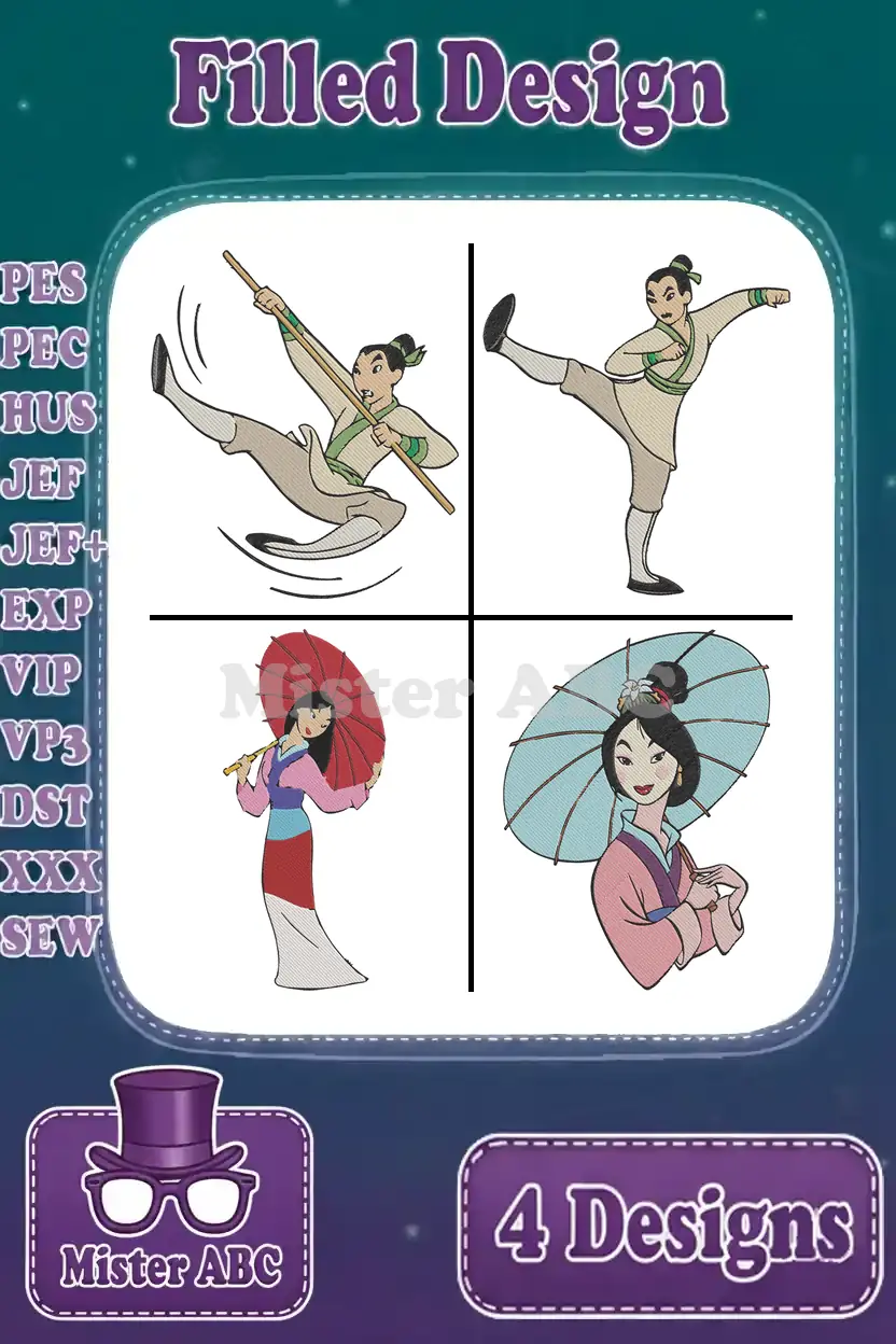 Mulan Ping Training Kicks Geisha With Parasol And Umbrella Character – Filled Embroidery Design
