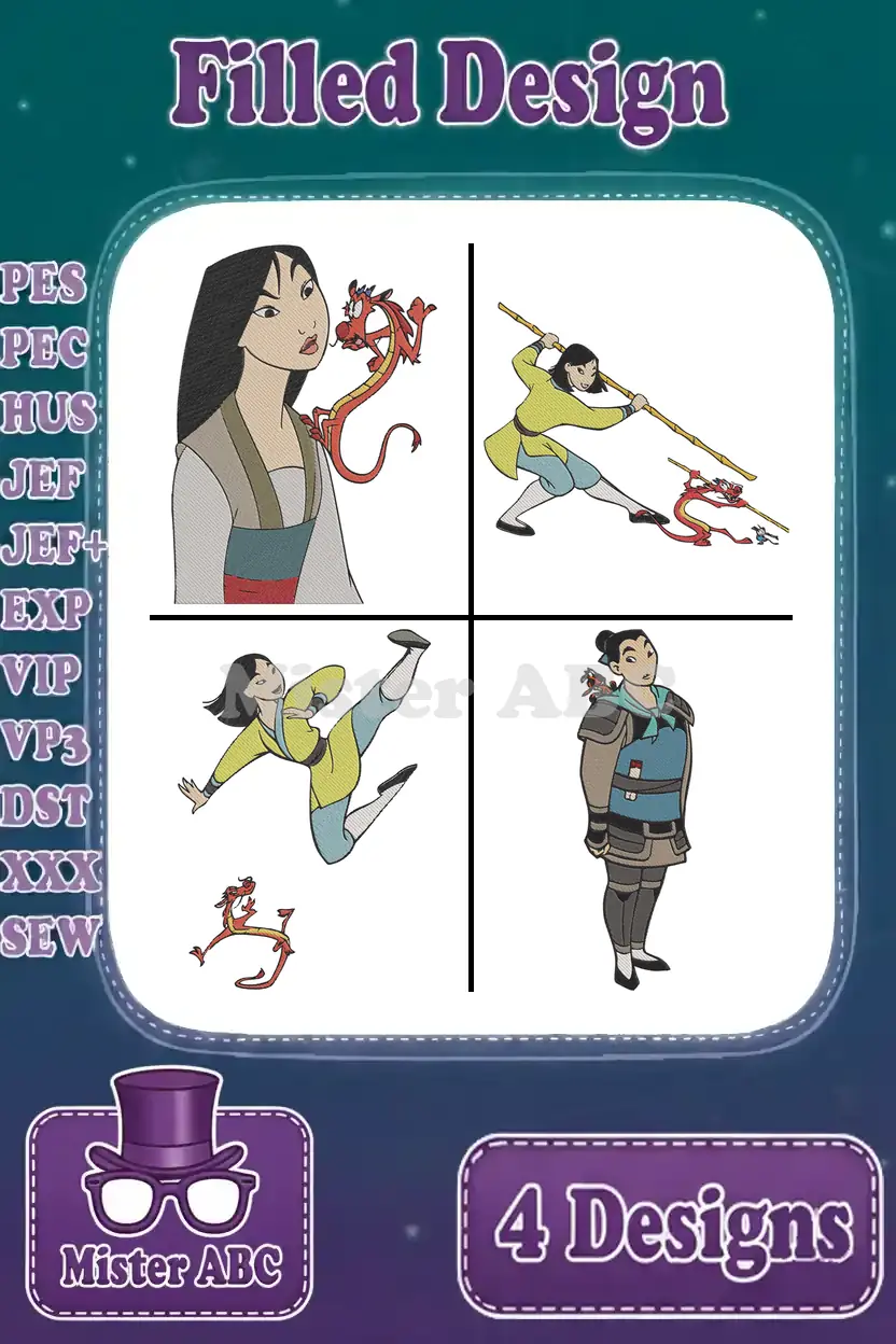Mulan Portrait With Mushu Training Staff Mushu Kicking Mushu And Ping Pose – Filled Embroidery Design