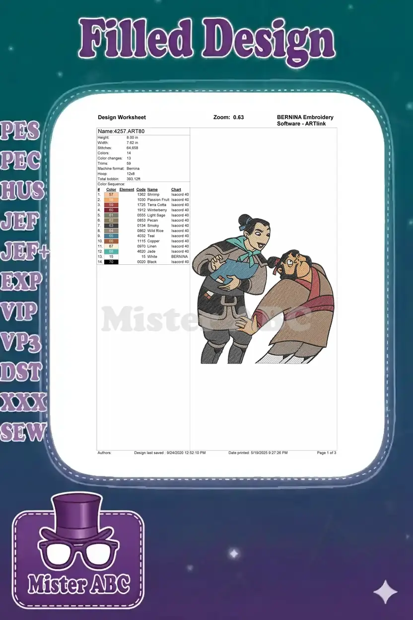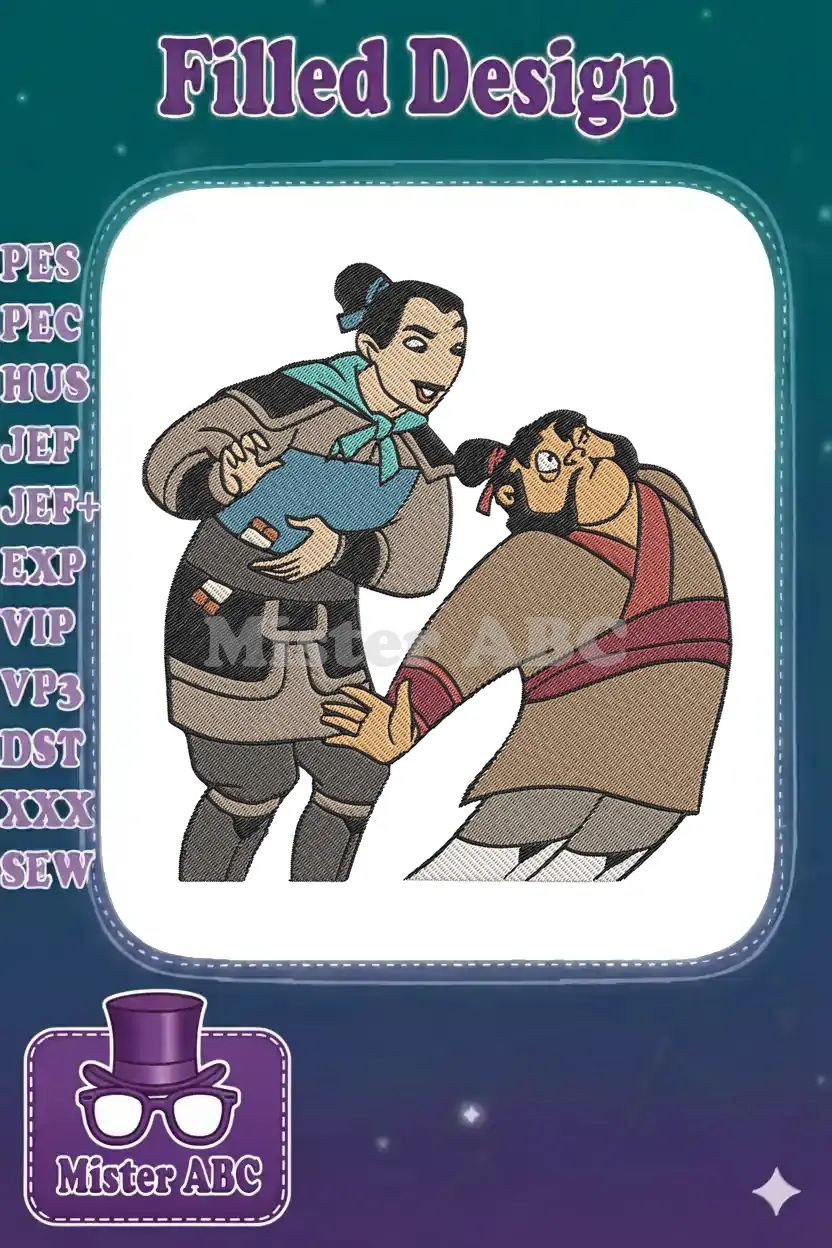 Celebrate love and family with this charming Mulan and Shang embroidery design, featuring their precious baby, perfect for fans.