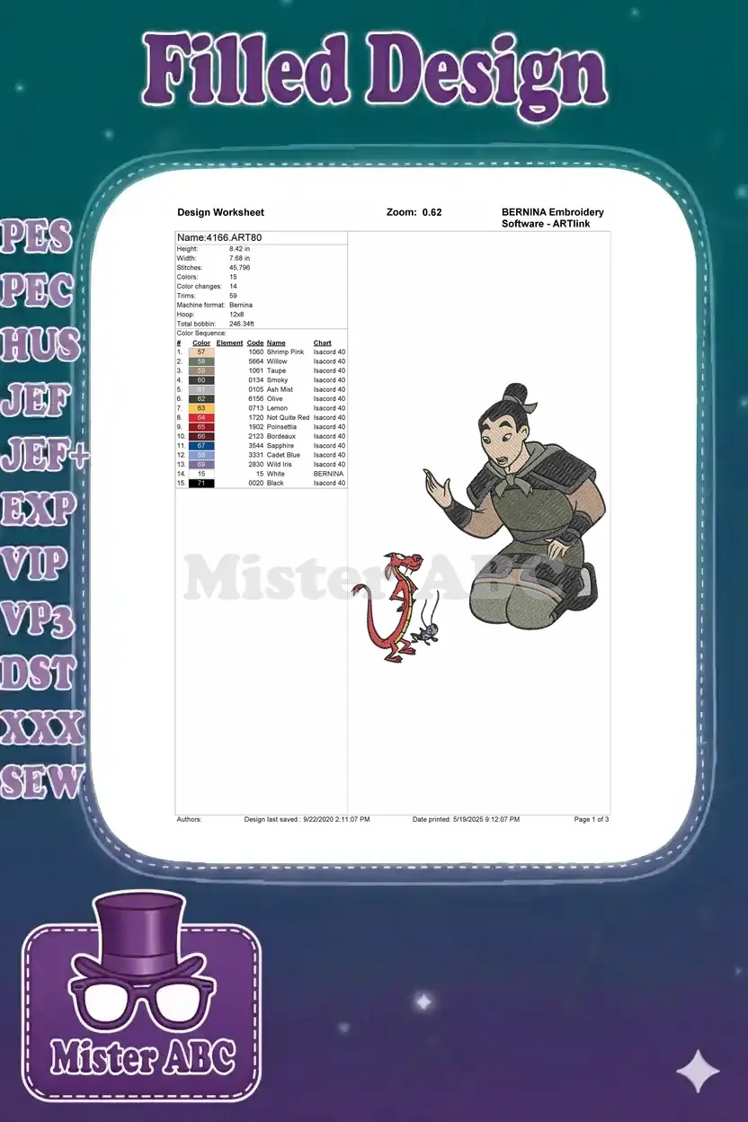 Mulan soldier Mushu Cri-Kee brave hero embroidery designs