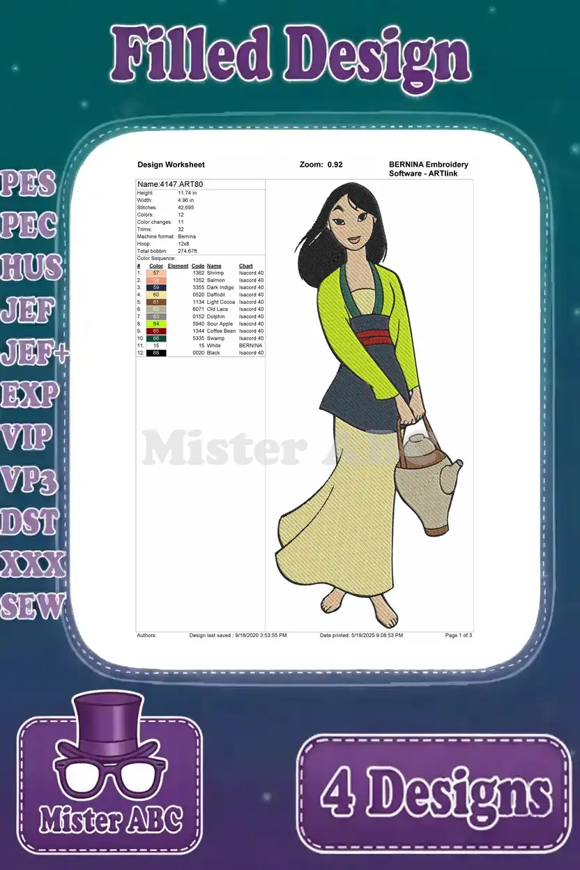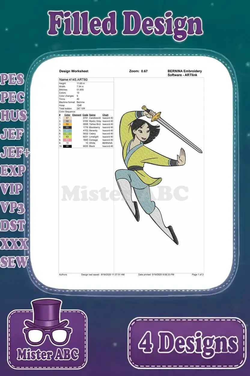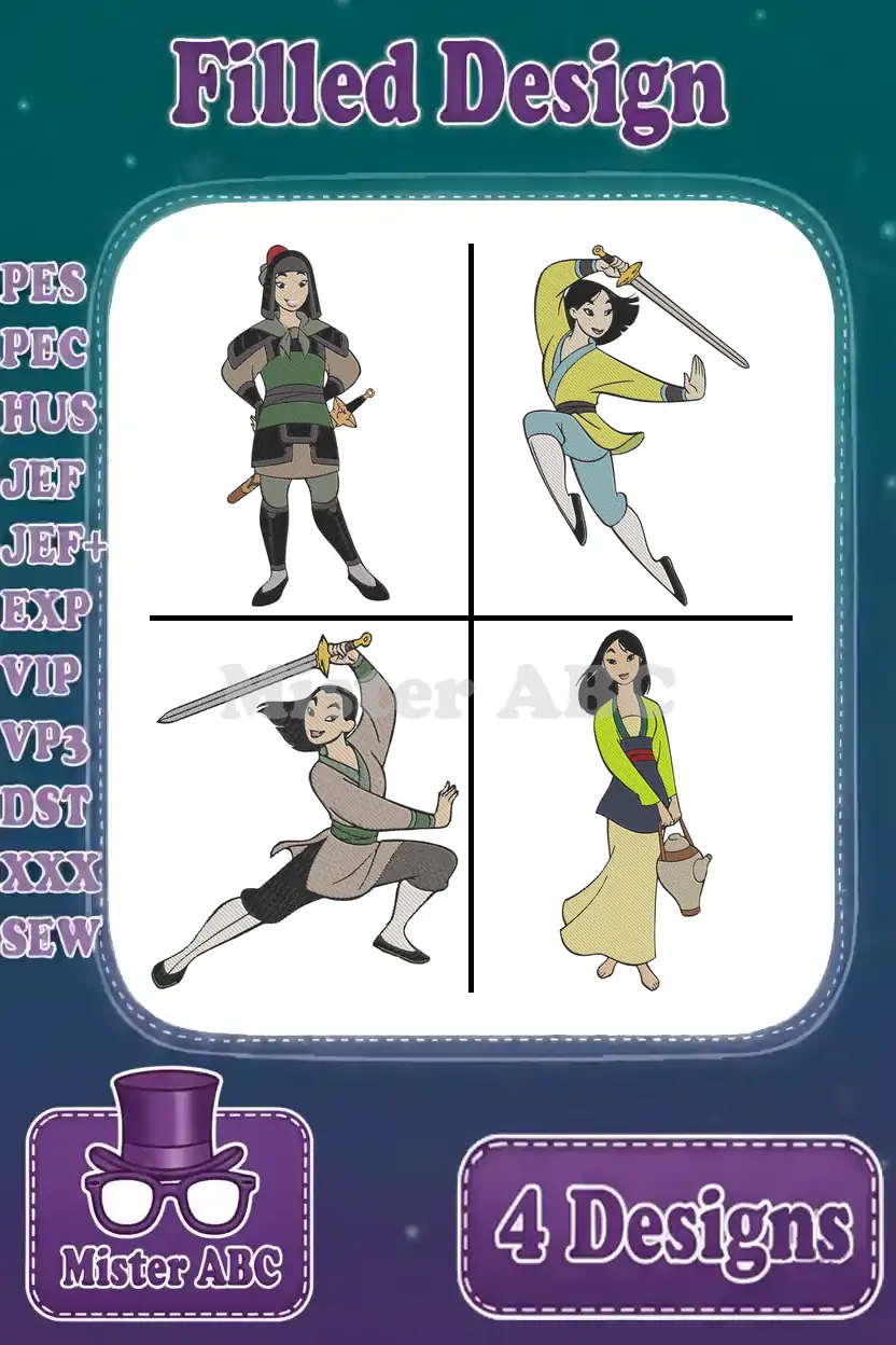 Mulan Warrior Outfit With Sword Ping Sword Fighting And Yellow Dress Poses – Filled Embroidery Design