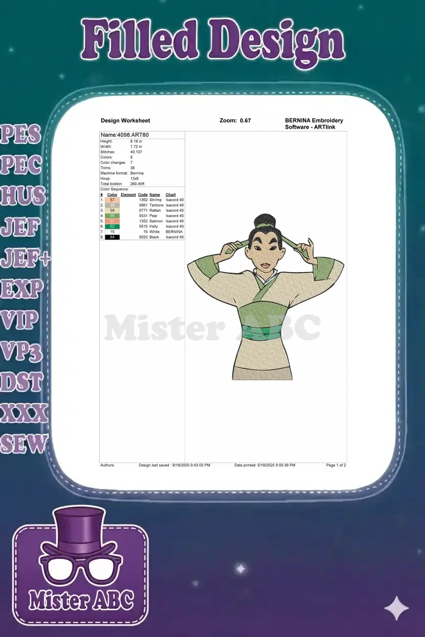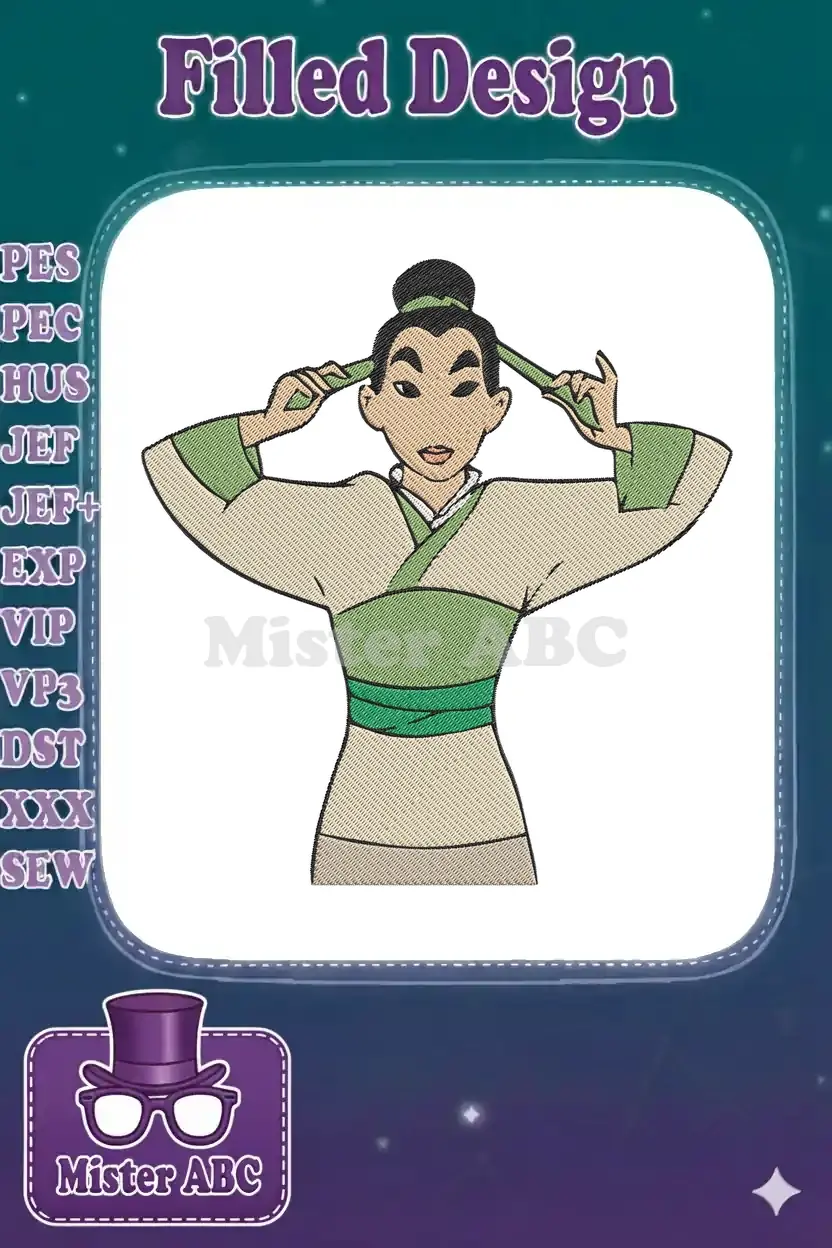 Mulan Warrior Princess Hair Styling Embroidery Designs