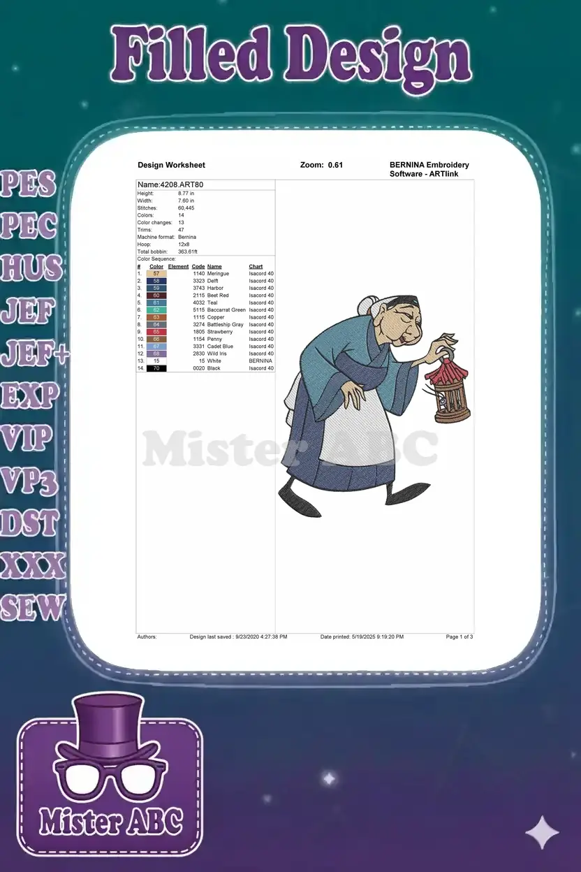 Charming Grandmother Fa embroidery design, capturing her iconic look with the lucky cricket cage. Perfect for Disney fans.