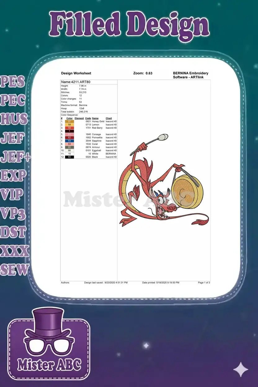 Mulan’s Mushu Red Dragon Hitting Gong Embroidery Designs