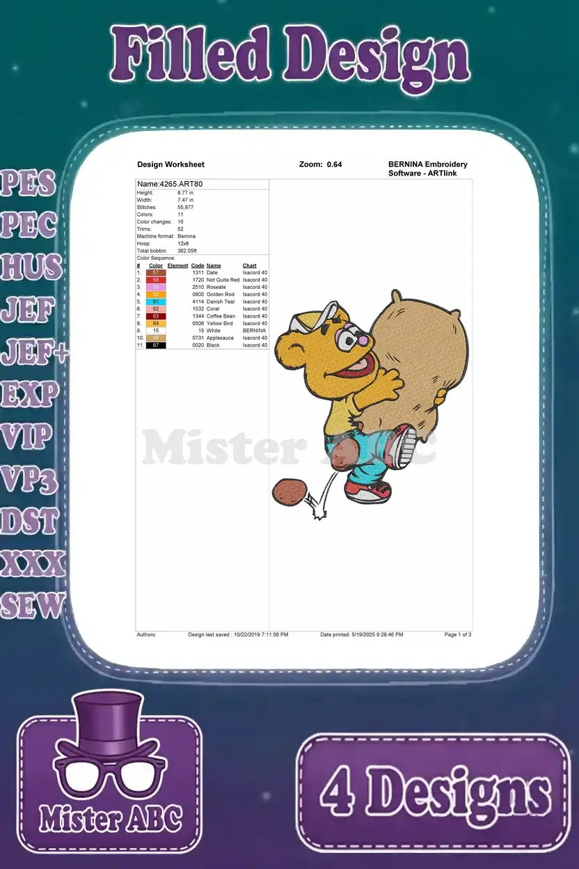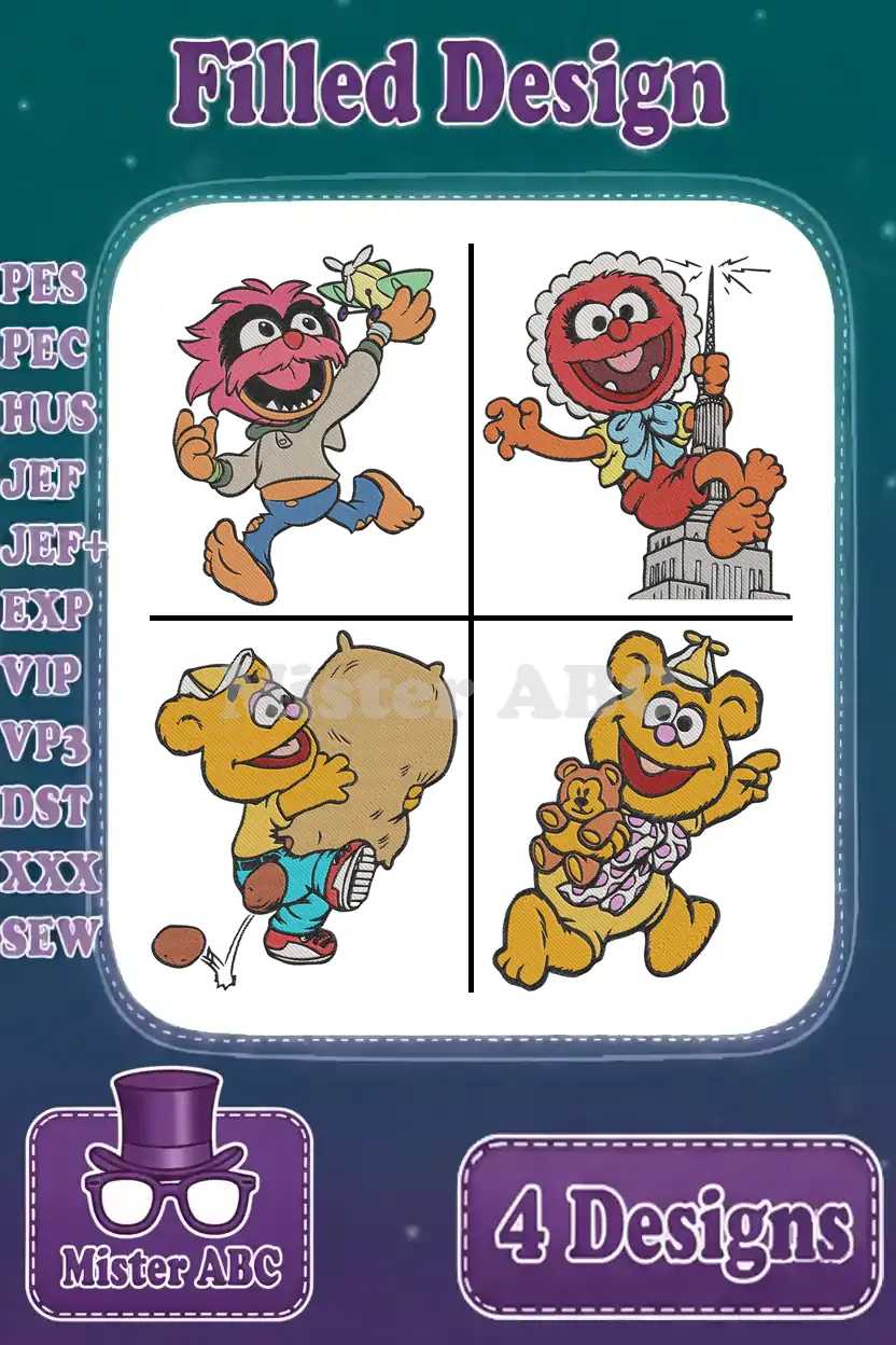 Muppet Babies Classic – Animal Drummer – Fozzie Bear Comedian – Scooter And Skeeter Twins – Playtime – Filled Embroidery Design