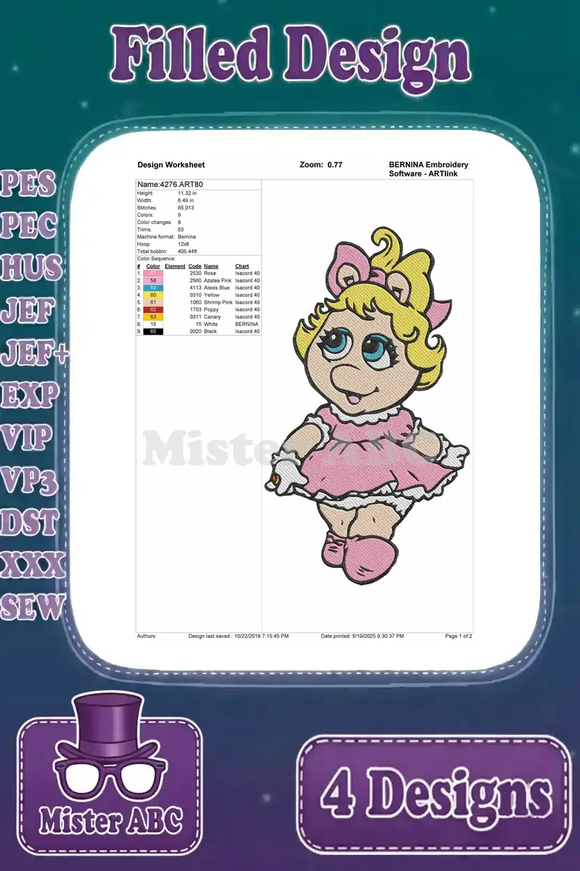 Adorable Baby Miss Piggy embroidery designs! A delightful collection of four filled stitch patterns for fans of cute characters. Perfect for children’s apparel and accessories.