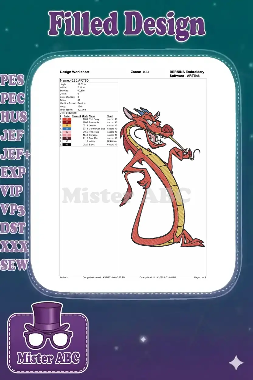 Mushu the Red Dragon Disney Mulan Embroidery Designs