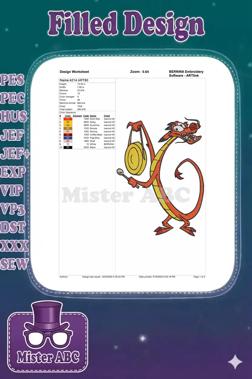 Mushu Red Dragon Holding Golden Gong Mulan Embroidery Designs