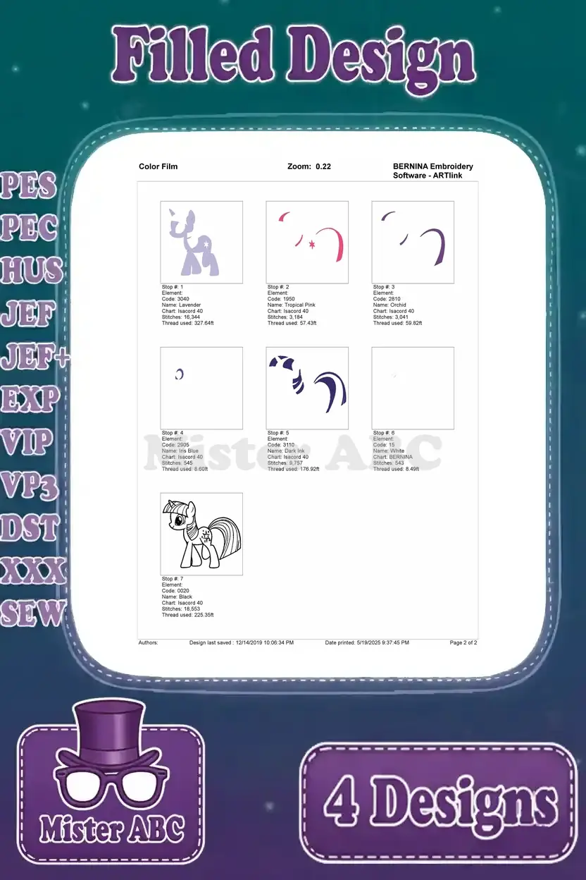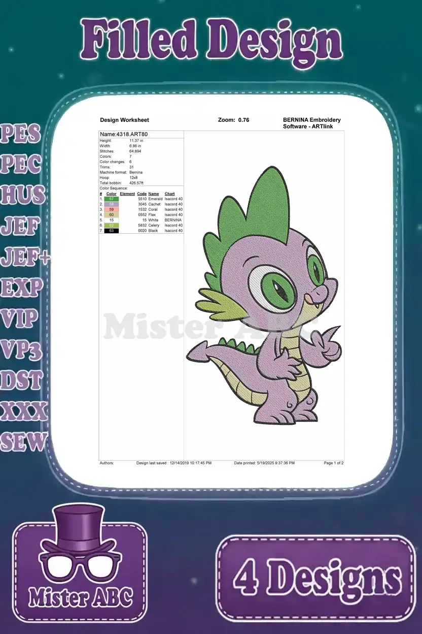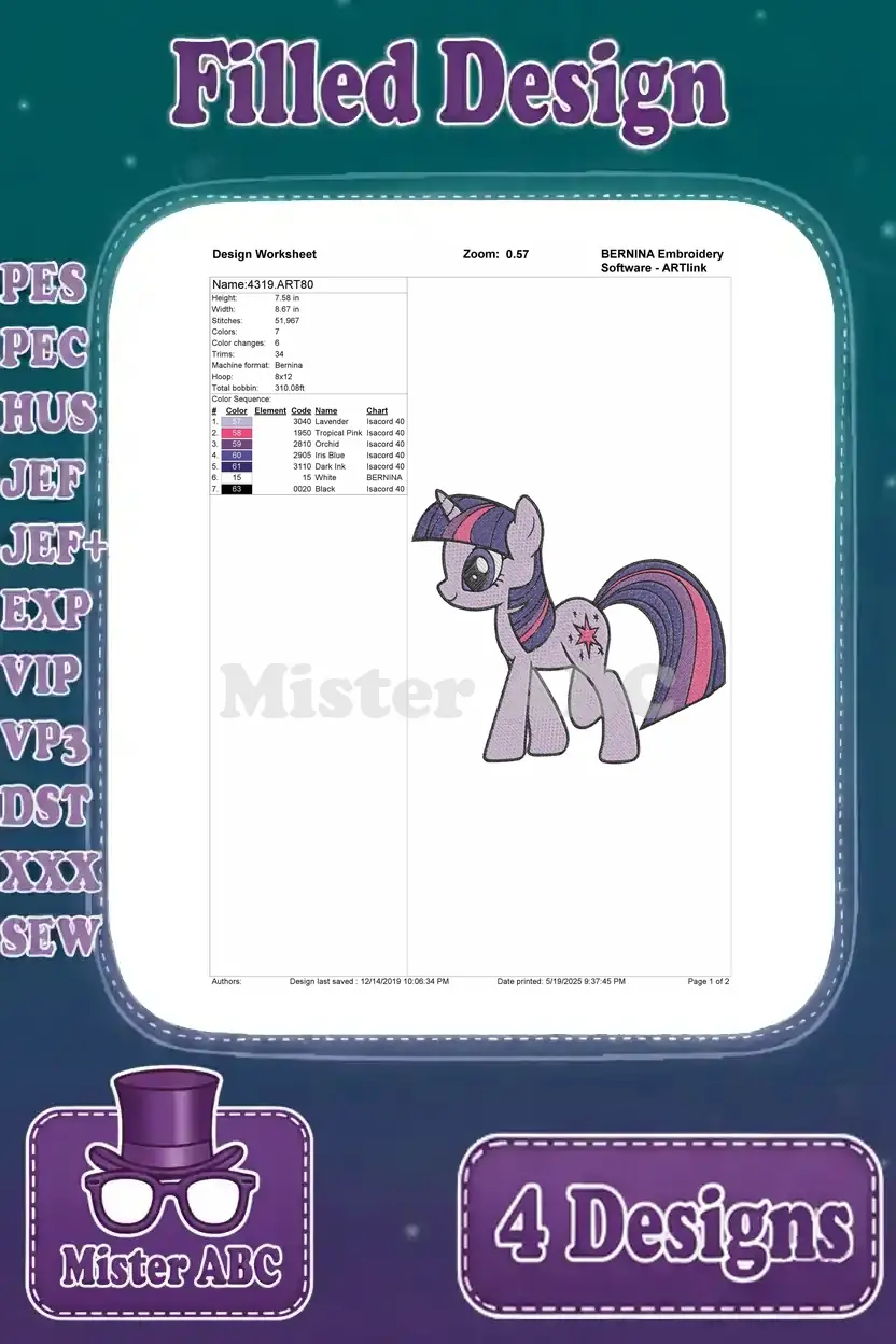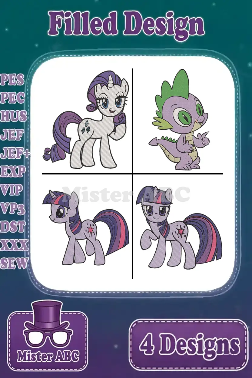 My Little Pony Friendship Is Magic – Twilight Sparkle Unicorn And Alicorn Forms – Spike The Dragon – Filled Embroidery Design