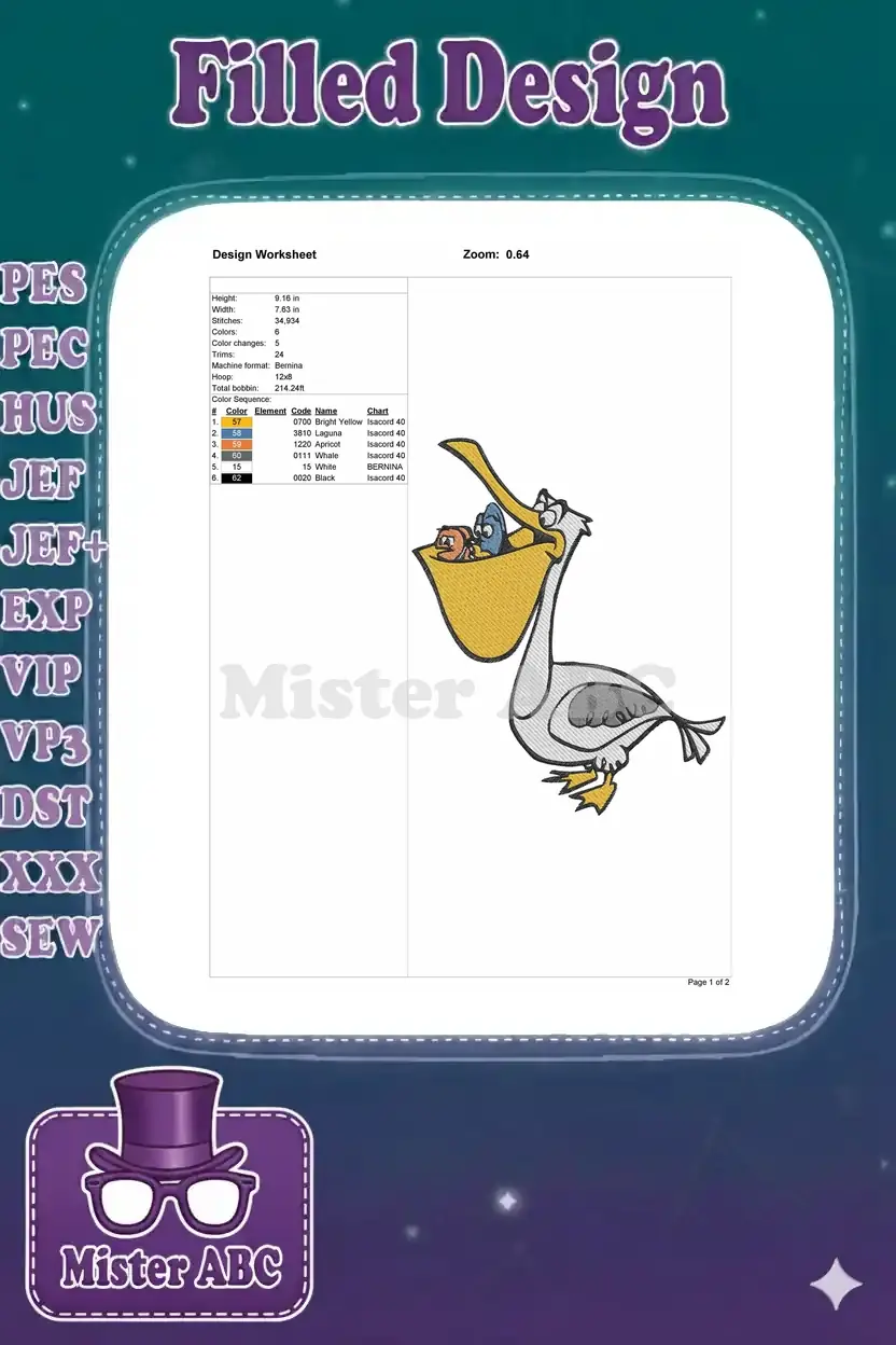 Nigel the pelican from Finding Nemo with fish embroidery designs