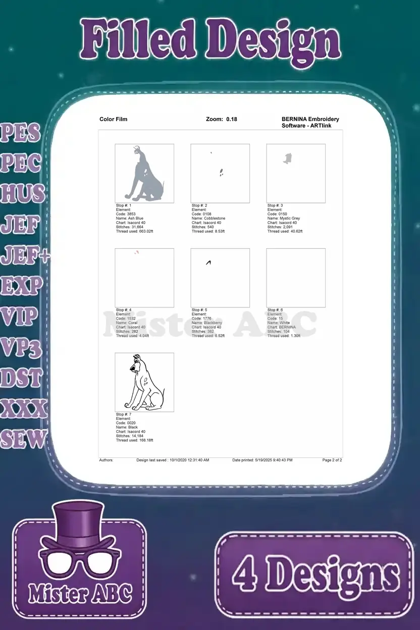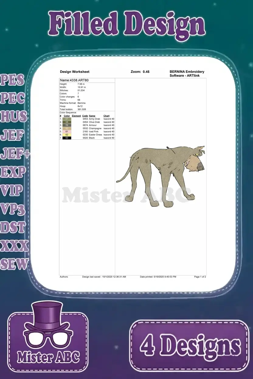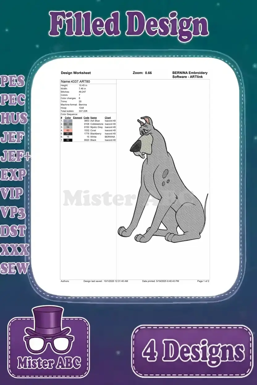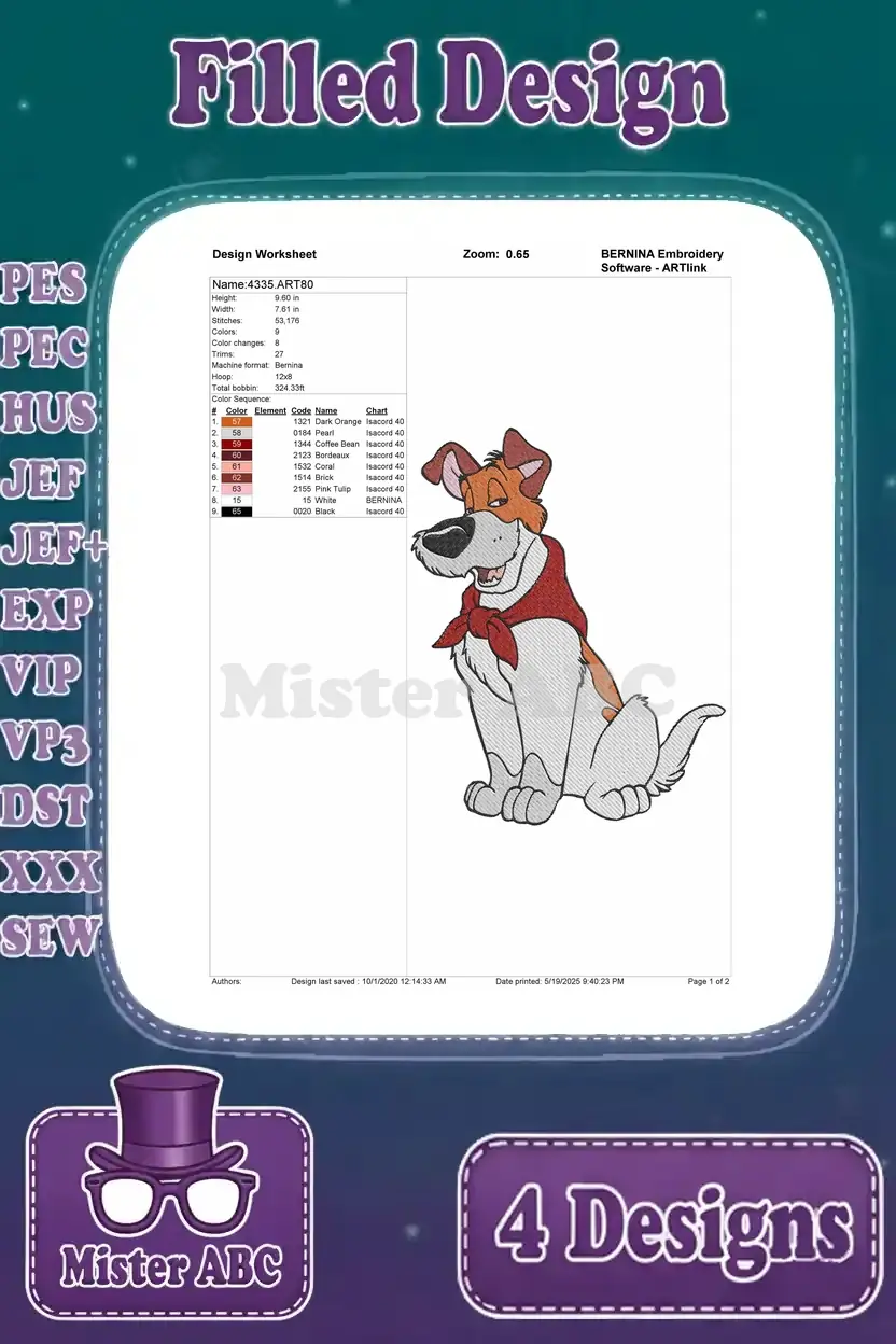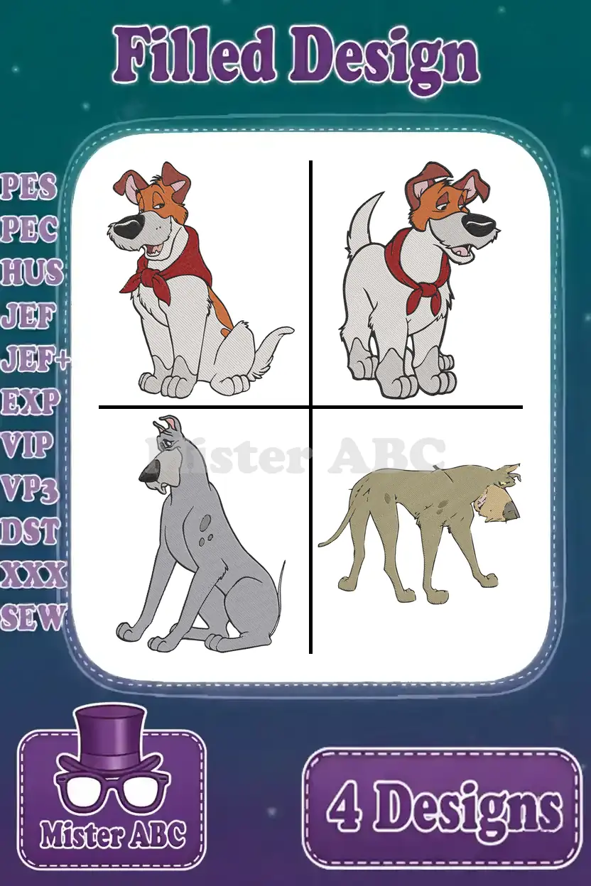 Oliver And Company – Dodger – Rita The Saluki – Tito The Chihuahua – Einstein The Great Dane – Gang Dogs – Filled Embroidery Design
