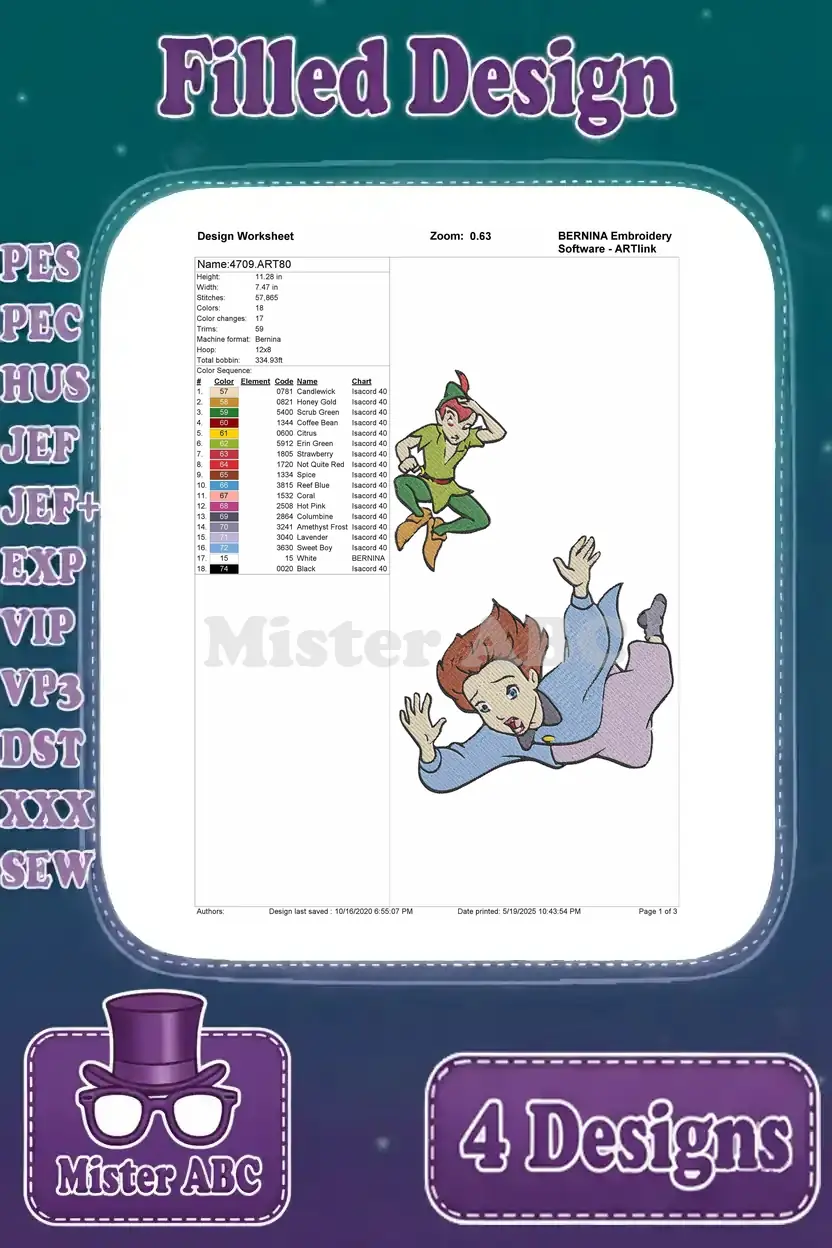 Peter Pan Flying With Wendy John Michael – Captain Hook And Tick Tock The Crocodile – Neverland Flight Scene – Filled Embroidery Design