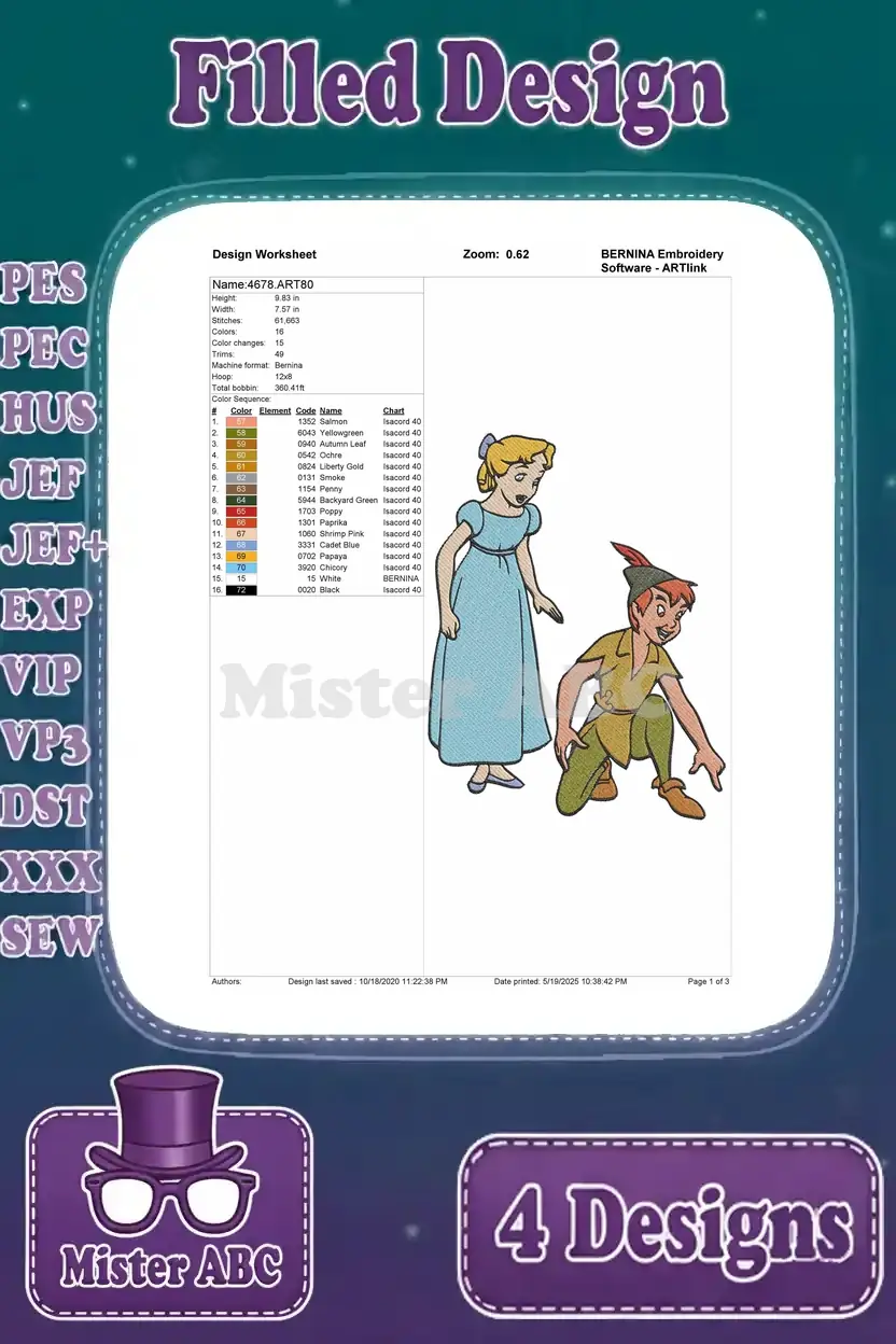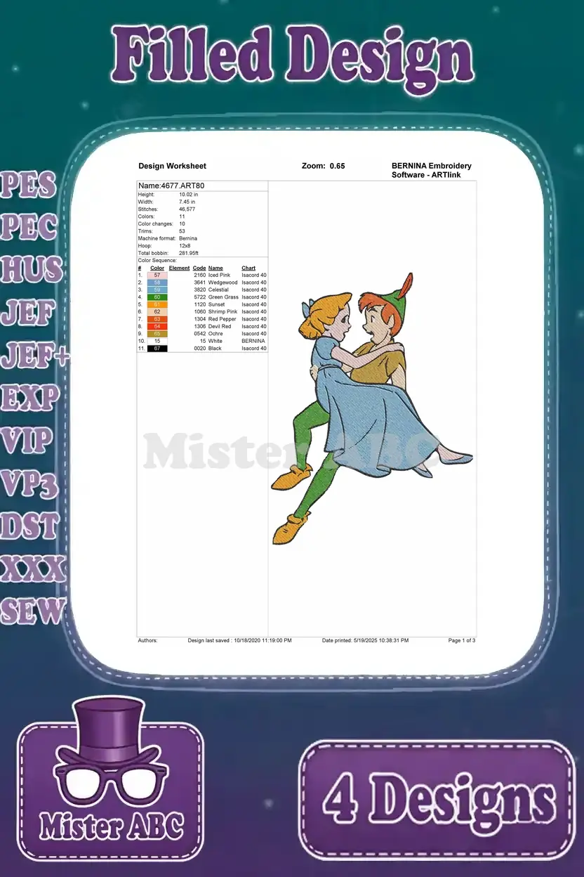 Peter Pan And Wendy Darling Soaring Over Neverland – Magical First Flight Together – Adventure Duo In The Sky – Filled Embroidery Design