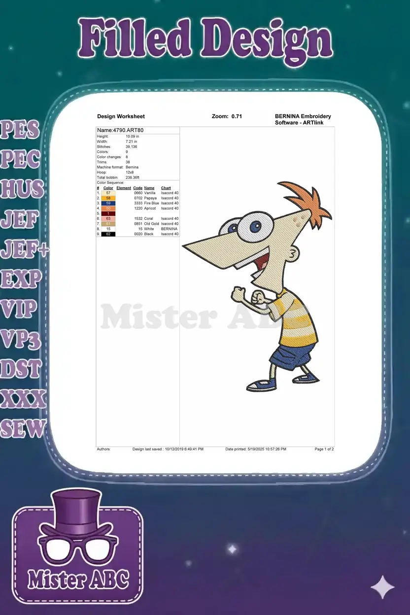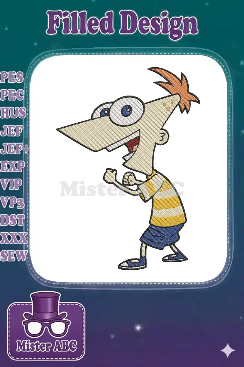 Phineas Flynn cartoon character embroidery designs for kids fun projects
