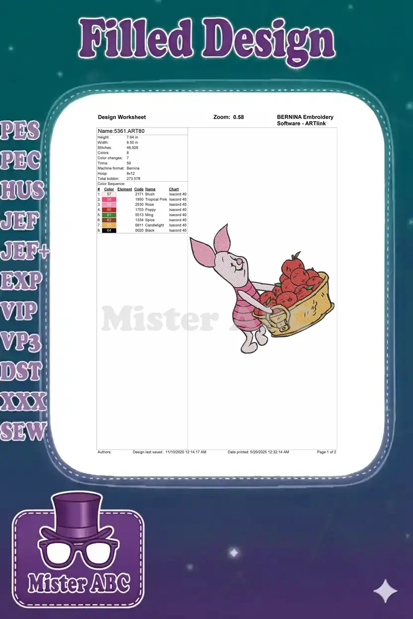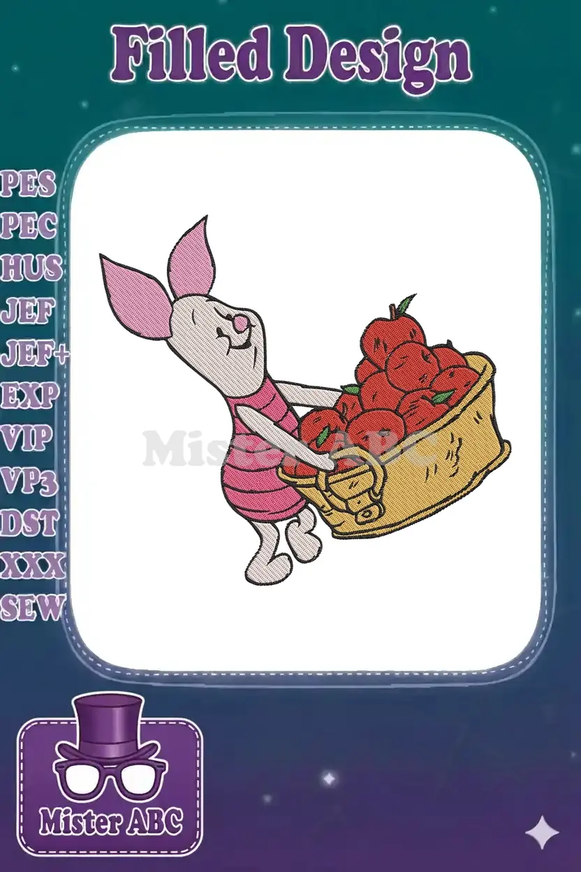 Piglet carrying basket of red apples embroidery designs for autumn